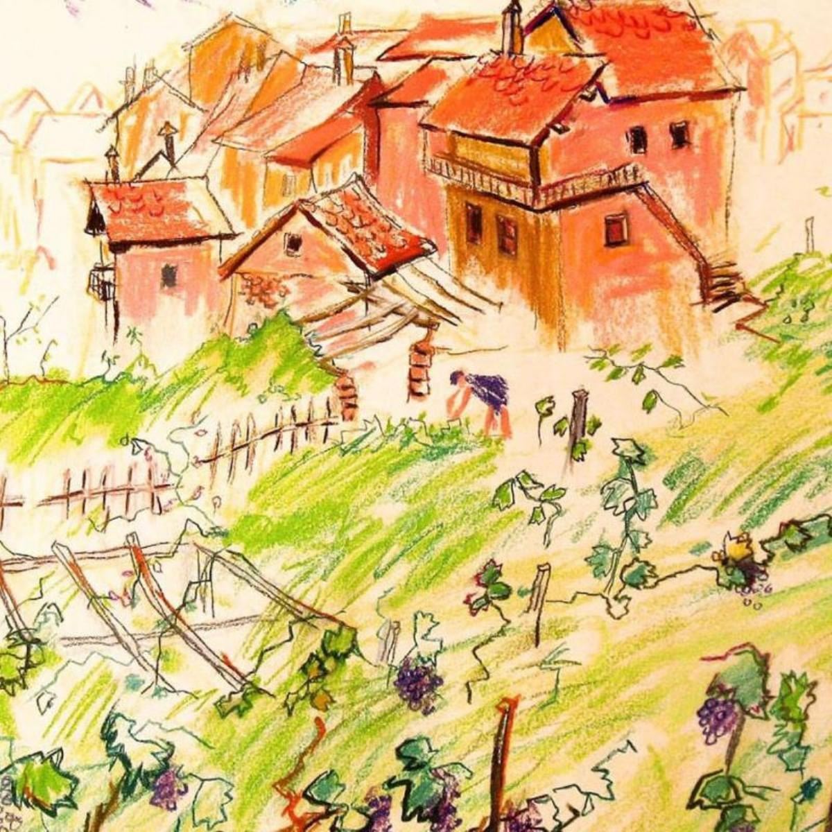 Mountain Vineyard in Italy by Ensrud Original. "Mountain Vineyard in Italy" is an original Pastel on Paper by Wayne Ensrud. The piece is hand signed by the artist and comes with a Certificate of Authenticity. Measures approximately 18" x 23".