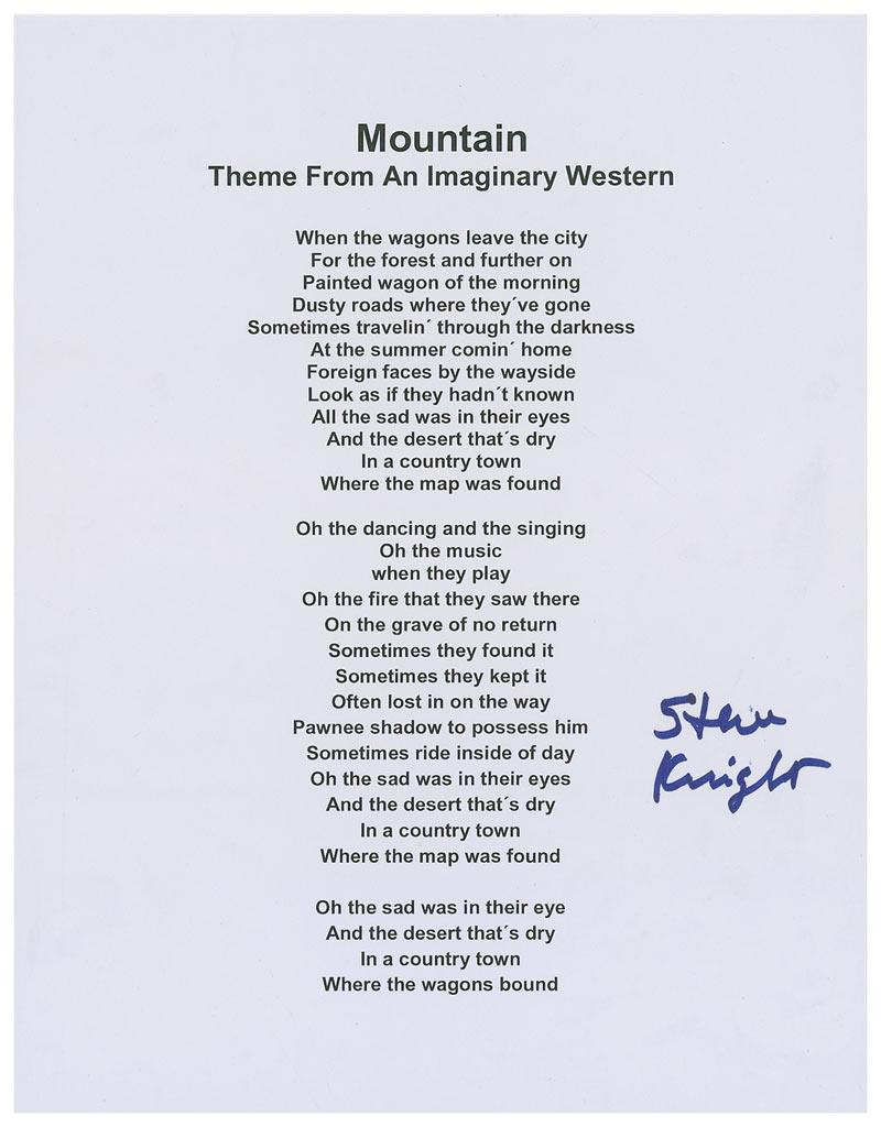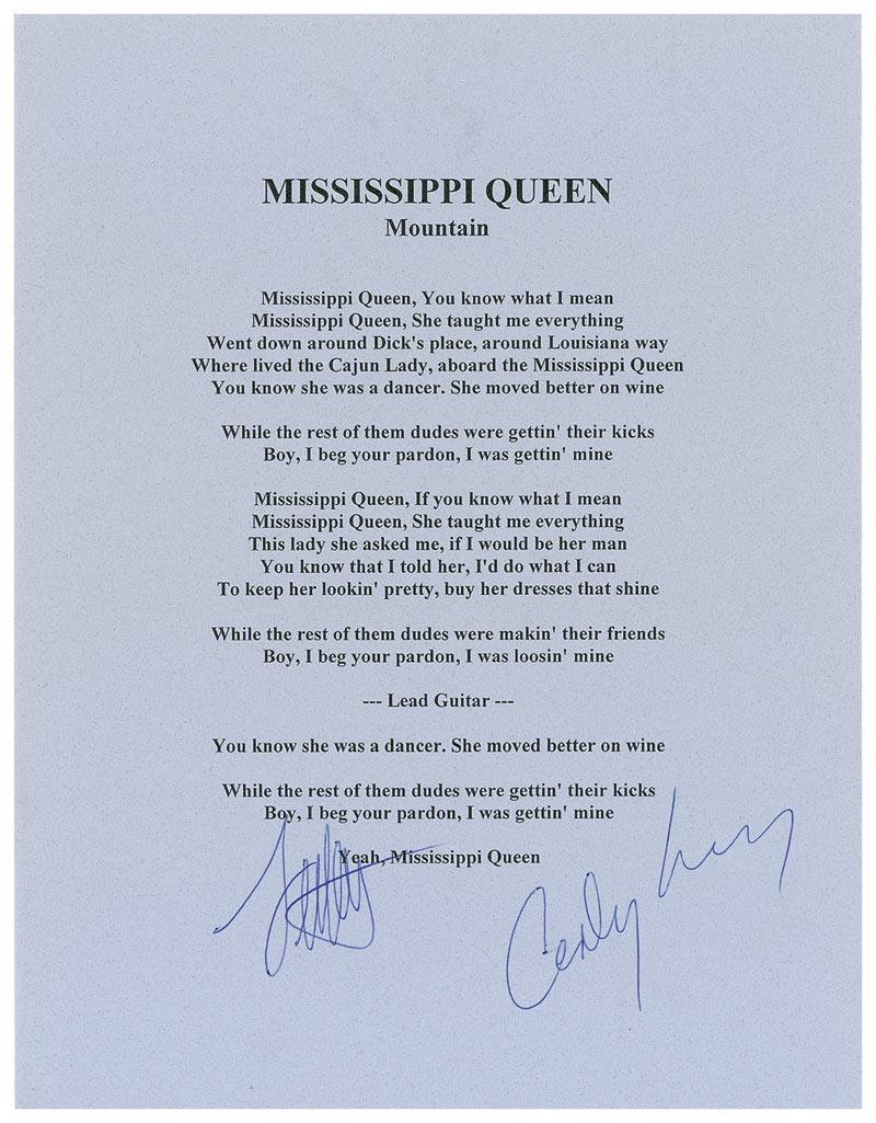 Two sheets of souvenir printed lyrics on individual 8.5 x 11 sheets: ‘Mississippi Queen’ signed by Leslie West and Corky Laing; and Theme from an Imaginary Western, signed by Steve Knight. In fine condition.