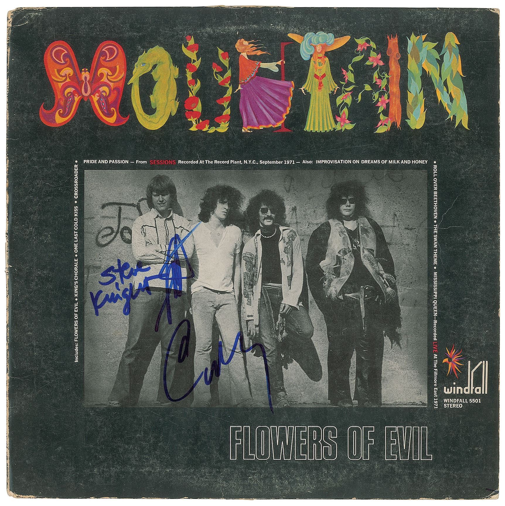Flowers of Evil album by Mountain, signed on the front cover in blue felt tip by Leslie West, Steve Knight, and Corky Laing. In very good to fine condition, with light scuffing and edge wear. The record is not included.
