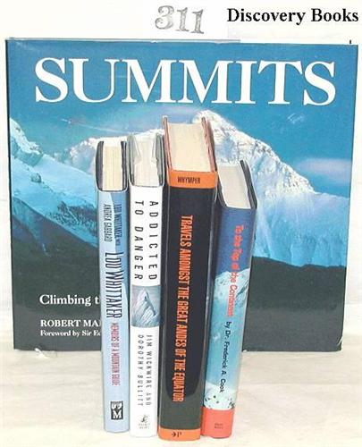 Mountaineering, General. (1) Wickwire, Jim & Dorothy Bullitt. ADDICTED TO DANGER. A MEMOIR. New York, (1998) 322pp. Illus. Cloth, fine in d/j. (2) Whymper, Edward. TRAVELS AMONGST THE GREAT ANDES OF THE EQUATOR. Salt Lake City, (c.1987) 456pp. Illus, fold. Map. Cloth, fine in d/j. (3) Cook, Frederick A. TO THE TOP OF THE CONTINENT. (Hurleyville, NY, 1996) 312pp. Illus, Cloth, fine in d/j. One of an edition of 200 copies. (4) Whittaker, Lou & Andrea Gabbard. LOU WHITTAKER. MEMOIRS OF A MOUNTAIN GUIDE. (Seattle, c.1994) 271pp. Illus. Cloth, fine in d/j. (5) Anderson, Robert Mads. SUMMITS. CLIMBING THE SEVEN SUMMITS SOLO. New York, (c.1995) Lg. Sq. 4to. 160pp. Many (mostly) color illus. Cloth, fine in d/j. (5)