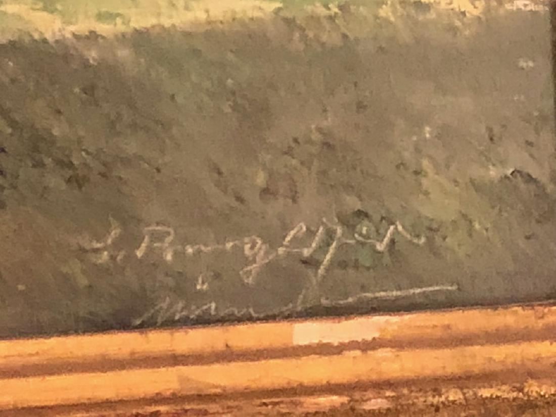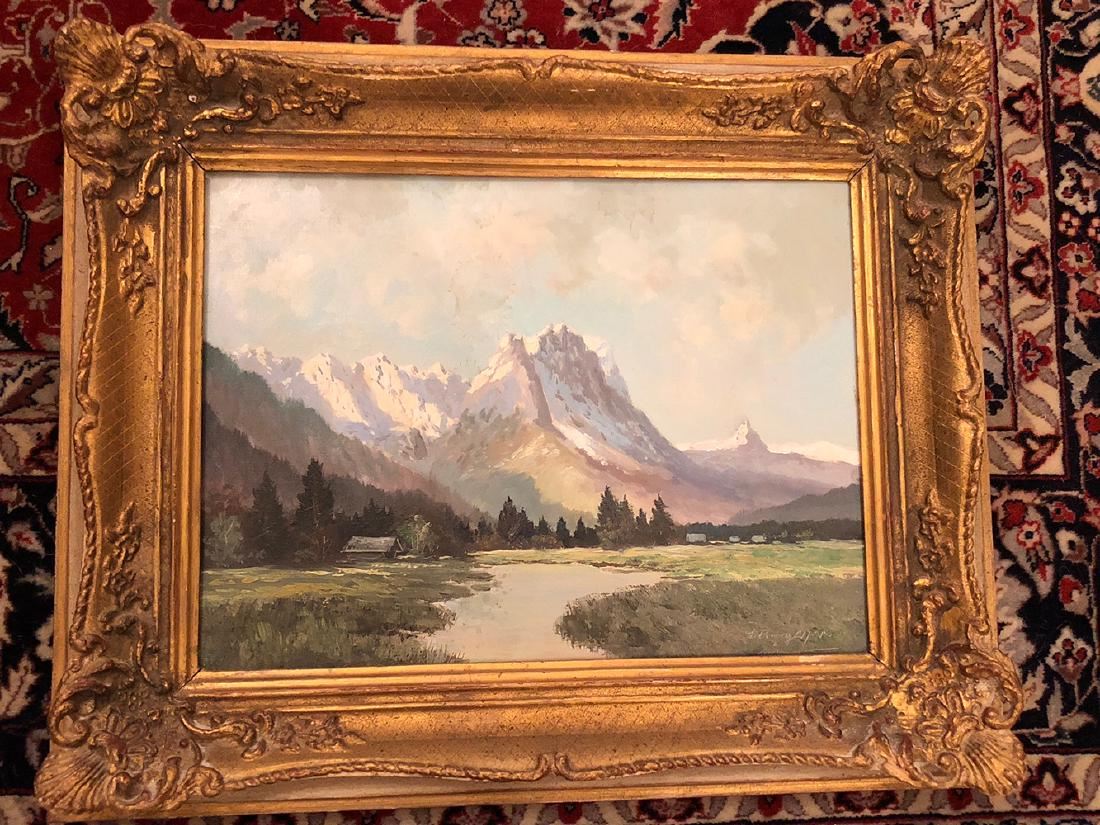 Snow capped mountains oil painting, signed, on canvas with beautiful gold gilt frame. Measures pprox. 21 1/2" wide x 17 1/2 tall frame size.
