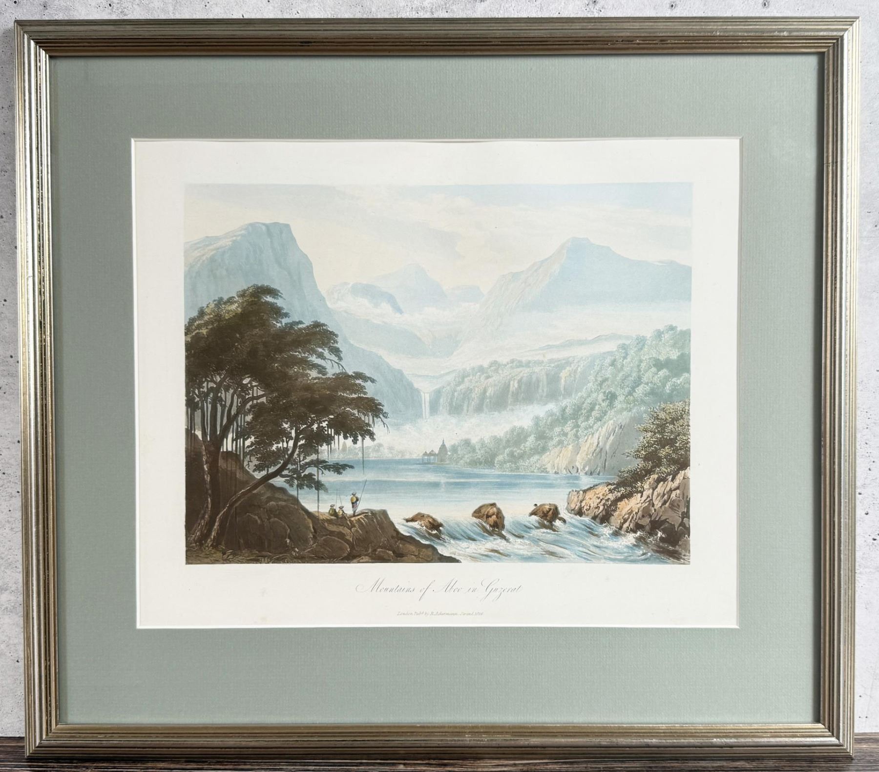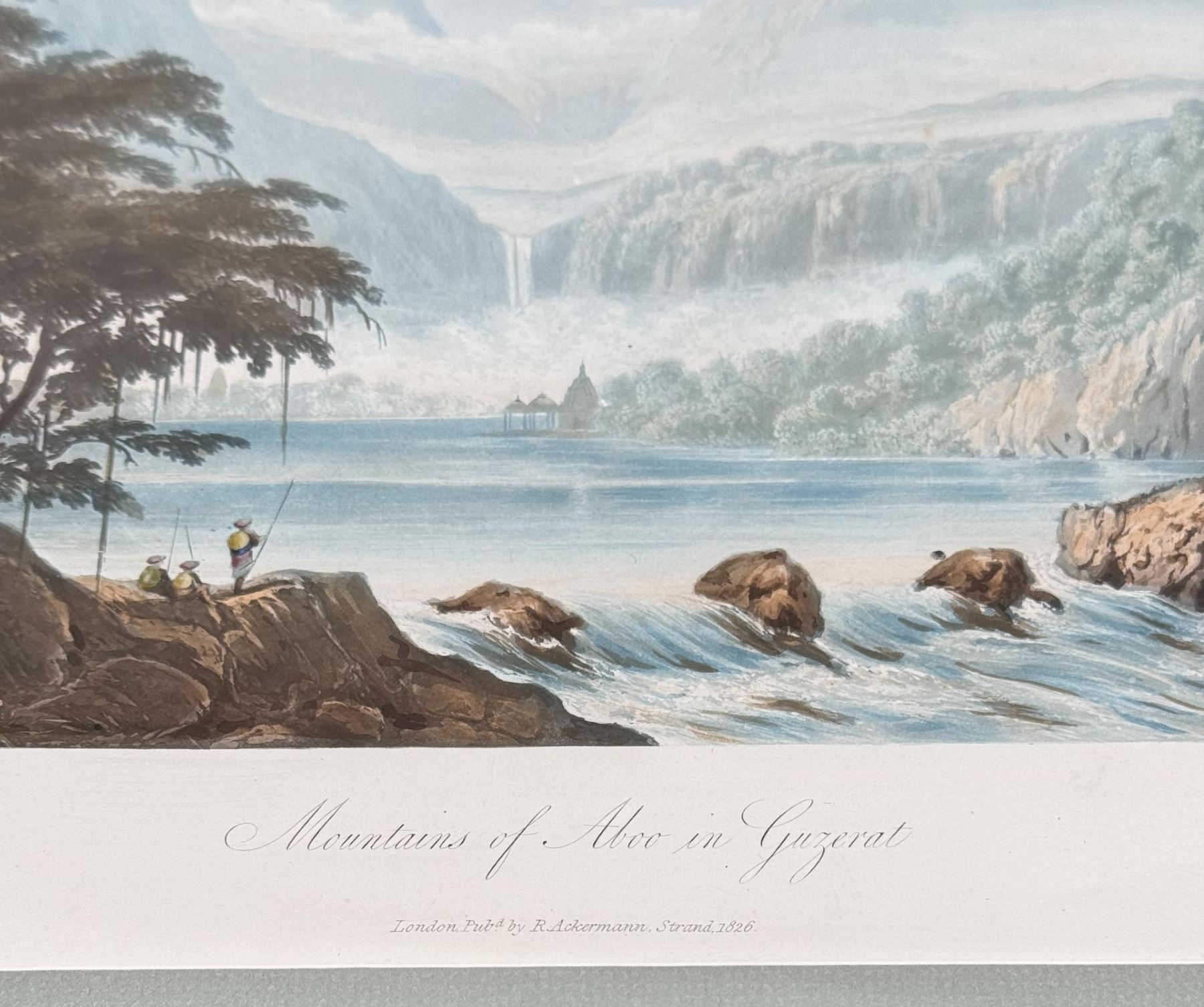 Mountains of Aboo in Guzerat, fifth plate in the incomplete book Scenery, Costumes and Architecture, chiefly on the Western Side of India by Captain Robert Melville Grindlay (London: R. Ackermann, 1826). Color aquatint with hand coloring. 16 1/4" by 18 1/2" framed.