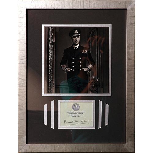 <Our item number 136830><B>Mountbatten, Louis, 1st Earl Mountbatten of Burma.</B> (1900-79) British admiral and statesman; last Viceroy of the British Indian Empire (1947) and first Governor-General of independent India (1947-1948); assassinated by Irish terrorists. Two signatures ("Mountbatten of Burma"), one as Supreme Allied Commander, South East Asia on 2¾ x 3¾ inch card or paper from the Dispatches and Records Office, London, n.d., and the second on 2½ x 4¾ inch paper, n.p., n.d. Both fine and matted with portraits; the first framed to 17½ x 13½ and the second to 10½ x 8 inches. <BR>Estimated Value $200 - 250. <BR><BR>Our item number 136830<BR><IMAGES><P ALIGN="CENTER"><IMG SRC="http://www.goldbergcoins.net/liveauction/49jpegs/136830.jpg"> </P></IMAGES>