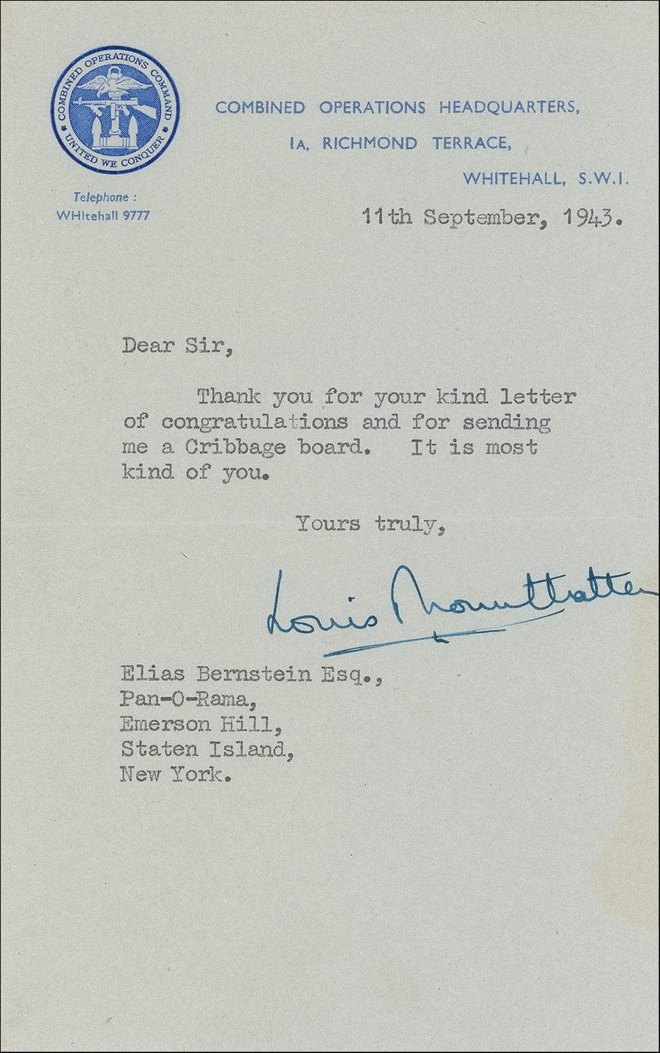 TLS signed “Louis Mountbatten,” one page, 4.5 x 7, Combined Operations Headquarters letterhead, September 11, 1943. Mountbatten writes Elias Bernstein of Pan-O-Rama in New York. In full: “Thank you for your kind letter of congratulations and for sending me a Cribbage board. It is most kind of you.” In fine condition, with light handling wear and a strip of toning along the right side, touching the end of his signature. Accompanied by the original mailing envelope.