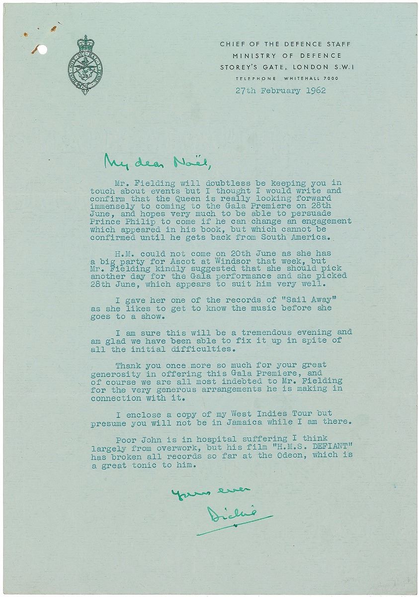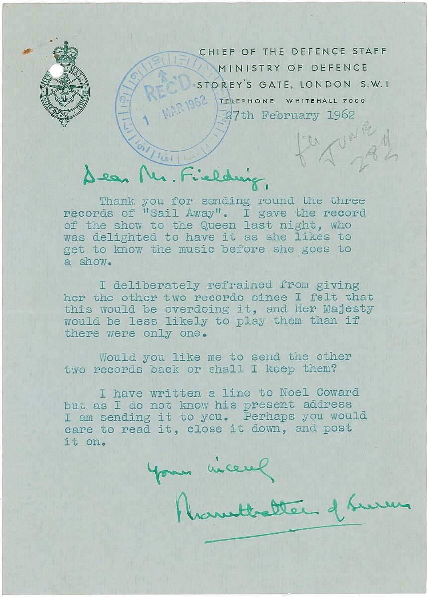 Two letters: a TLS signed “Mountbatten of Burma,” one page, 6.75 x 8.25, Ministry of Defence letterhead, February 27, 1962. Letter to theatrical producer Harold Fielding. In part: “Thank you for sending round the three records of ‘Sail Away.’ I gave the record of the show to the Queen last night, who was delighted to have it as she likes to get to know the music before she goes to a show. I deliberately refrained from giving her the other two records since I felt that this would be overdoing it, and Her Majesty would be less likely to play them than if there were only one…I have written a line to Noel Coward”; and a TLS signed “Dickie,” one page, 8.25 x 11.75, same date. The aforementioned letter to Noel Coward, in part: “I thought I would write to confirm that the Queen is really looking forward immensely to the Gala Premiere on 28th June, and hopes very much to be able to persuade Prince Philip to come…I gave her one of the records of ‘Sail Away’ as she likes to get to know the music before she goes to a show.” In overall fine condition, with punch and rusty staple holes to upper left corners. The musical, for which Coward wrote the book, music, and lyrics, made its London premiere at the Savoy Theatre in June 1962.