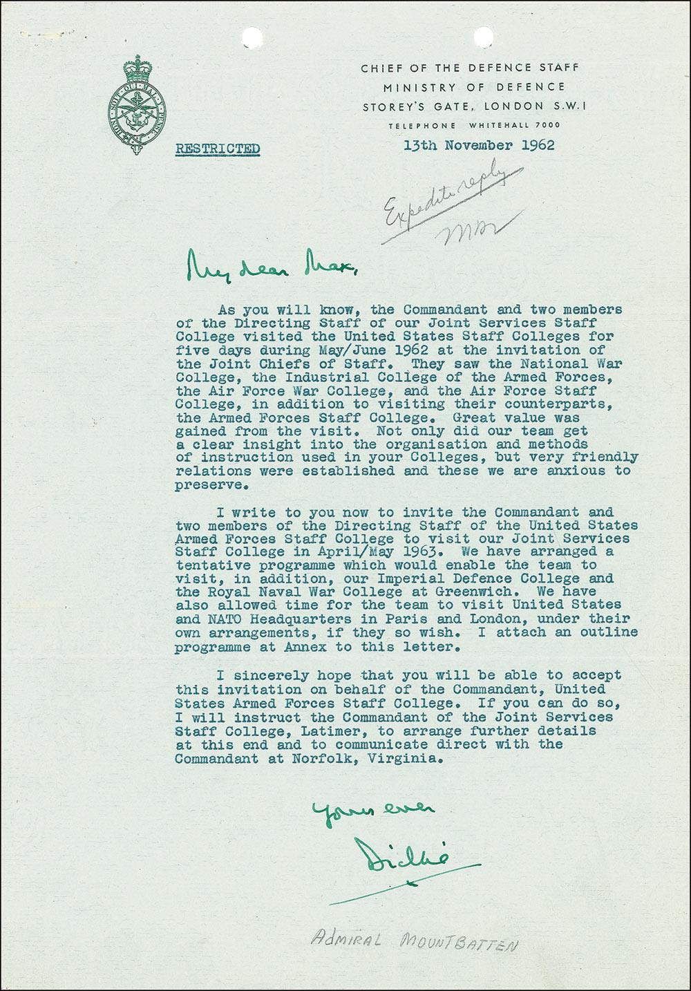 British admiral and statesman (born 1900), uncle of Prince Philip, and Supreme Allied Commander in Southeast Asia during World War II, who was killed by an IRA bomb in 1979. TLS signed “Dickie,” one page, 8.25 x 11.75, Chief of the Defence Staff letterhead, November 13, 1962. Letter marked at the top “restricted,” in which Mountbatten extends an invitation to a United States counterpart. In part: “As you will know, the Commandant and two members of the Directing Staff of our Joint Services Staff College visited the United States Staff Colleges for five days during May/June 1962 at the invitation of the Joint Chiefs of Staff. They saw the National War College, the Industrial College of the Armed Forces, the Air Force War College, and the Air Force Staff College. Great value was gained from the visit. Not only did our team get a clear insight into the organisation [sic] and methods of instruction used in your Colleges, but very friendly relations were established and these we are anxious to preserve. I write now to invite the Commandant and two members of the Directing Staff of the United States Armed Forces Staff College to visit our Joint Services Staff College.” Pencil notation above signature, and pencil office notation at top, and punch and staple holes along top edge, otherwise fine condition. Accompanied by a one page outline for the proposed visit. Pre-certified PSA/DNA and RRAuction COA.