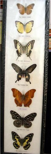 Mounted American butterfly collection in good condition. Lime, Blue Tiger, Cruiser, Common Rose, Spot Swordtail, Lemon Emigrant and Common Leopard measures 20 1/2" x 6"
