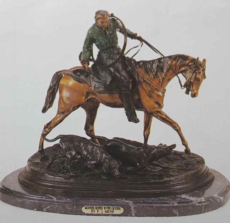 "Mounted Hunter With Two Hounds" Bronze Sculpture - After Mene - Beautiful Patina/Museum Brown Finish - Mounted On A Fine Italian Marble Base - Beautifully Detailed - Signed - Mint Condition - 17.5"H X 20.5"W - Lost Wax Cast Bronze