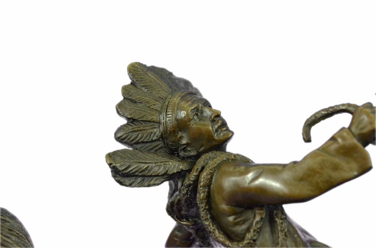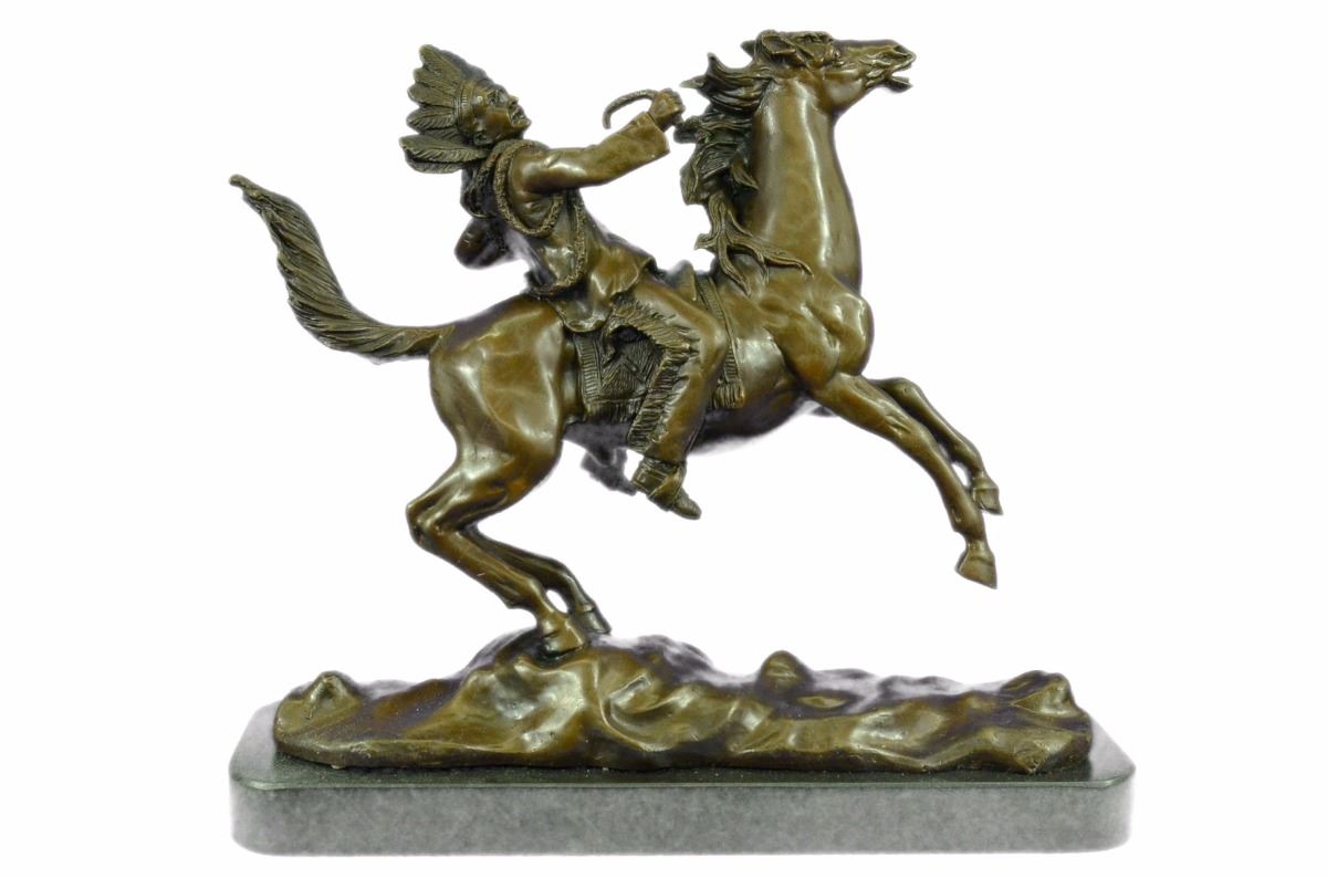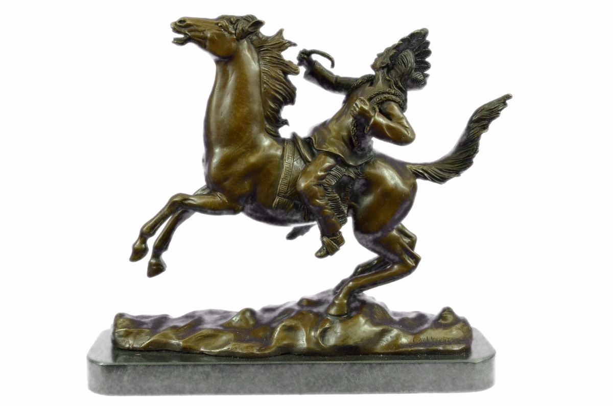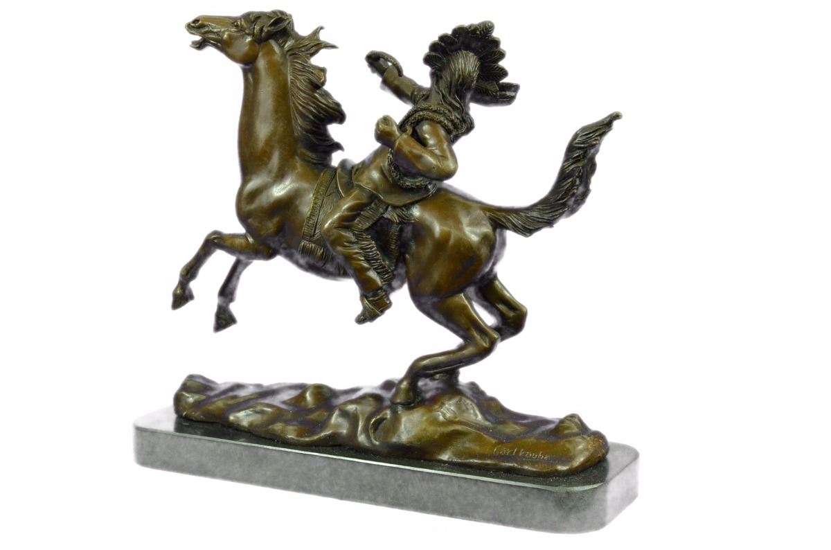 This Monumental Sculpture Of A Mounted Indian Chief Was Sculpted By Artist Carl Kauba (Austrian, 1865-1922). Kauba Was Famed For His Portrayals Of Iconic Images Of The American Frontier, Which Is Particularly Remarkable Since He Never Had The Opportunity To View His Subject Matter In Person. Please Click On The Thumbnail Images Above To See Additional Views And Click On Any Image To Enlarge It. We Have Cast Mounted Indian Chief In Our Own European Art Foundry Using Pure Bronze. The Sculpture Is Finished With A Classic Patina In Tones Of Browns And Black That Enhances The Beauty Of The Horse And The Rocky Landscape Upon Which It Proudly Stands. Mounted Onto A Black Marble Base. Bronze Dimensions With Marble Base: Height 12 X Width 14 inches. Weight: 20 Lbs. This Is Not An Original Of His Work But A Recent Reproduction. FT034FT034