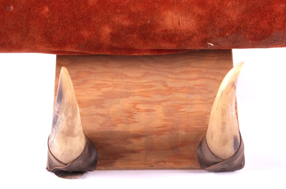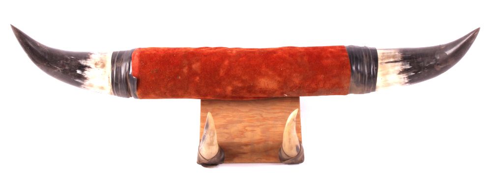 This is a set of mounted Texas longhorns. The horns are mounted with a smaller set that serve as hooks on this piece. The mounted longhorns are in good condition. They measure 34.25" wide.