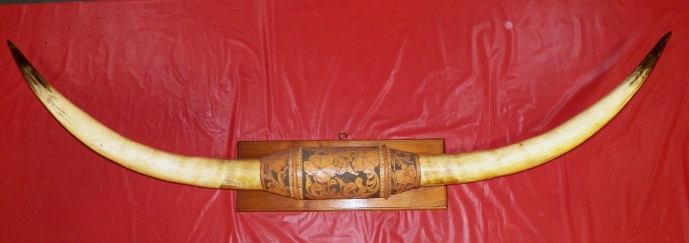 Nice set of Longhorns approx 75" from tip to tip with a beautiful tooled leather binder in middle