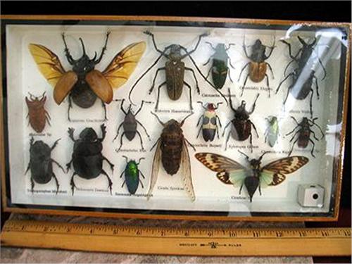 Mounted collection of large beetles hymenoptera in good condition, frame measures 14" x 8" by 1 7/8" deep