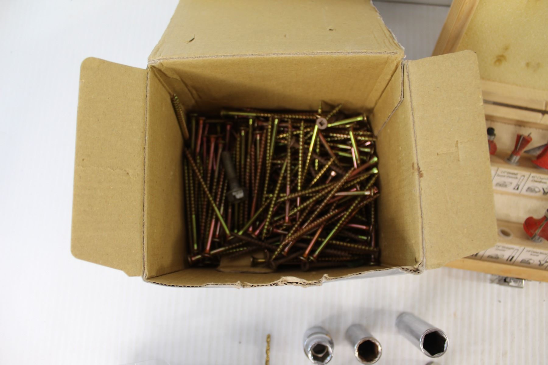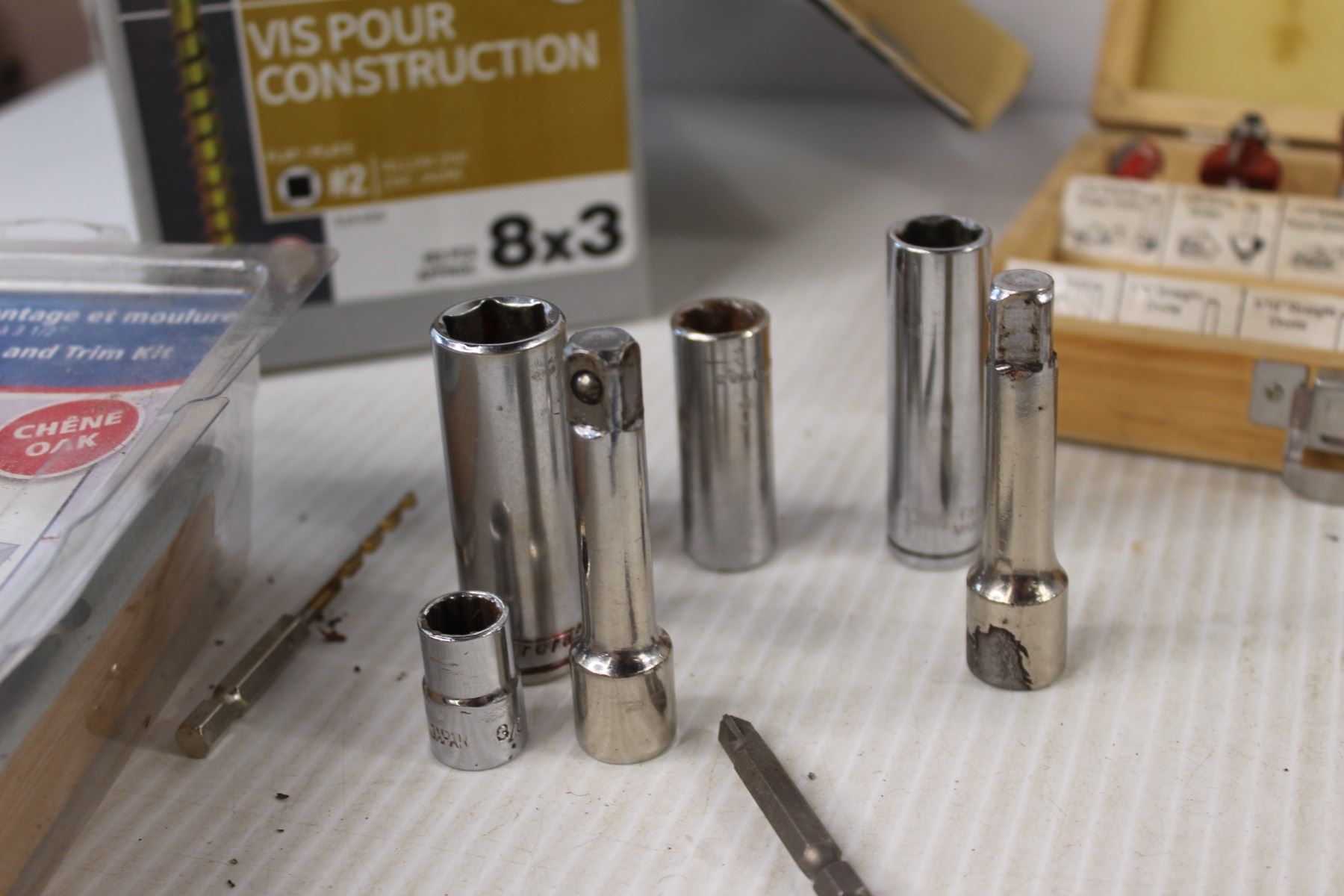 Mounting Plate Trim Kit, Router Bit Set, Construction Screws, Leather Tool Belt, (7) Sockets/Socket Extenders, Wrench