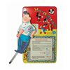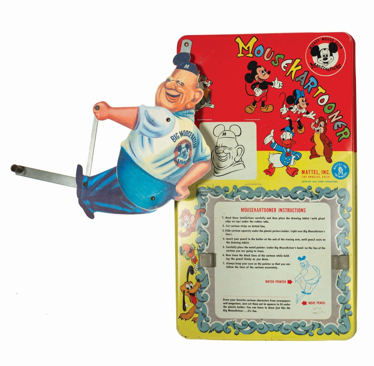 (Mattel, c.1950s) A very rare vintage Mousekartooner drawing toy manufactured by Mattel. The piece consists of a tin-litho tablet with an articulated metal arm onto which a die cut paper figure of the "Big Moosketeer" Roy Williams is attached. No accessories are included. Measuring 15"x8.75", the piece is in good condition. The Williams figure is missing an ear from his Mouseketeer hat and exhibits some creasing. The tablet has some surface loss in spots and at the edges, minor scuffs and scratches, and faint oxidation to exposed metal areas.