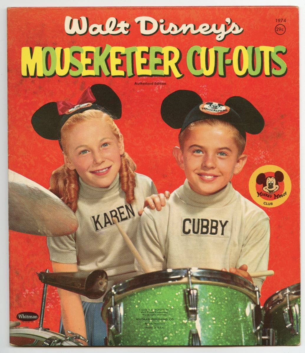 (Whitman, 1957) Mouseketeer Cut-Outs paper doll set with Karen and Cubby. Measures 12"x10.25" Very good condition with a 1" tear on the inside of the cover