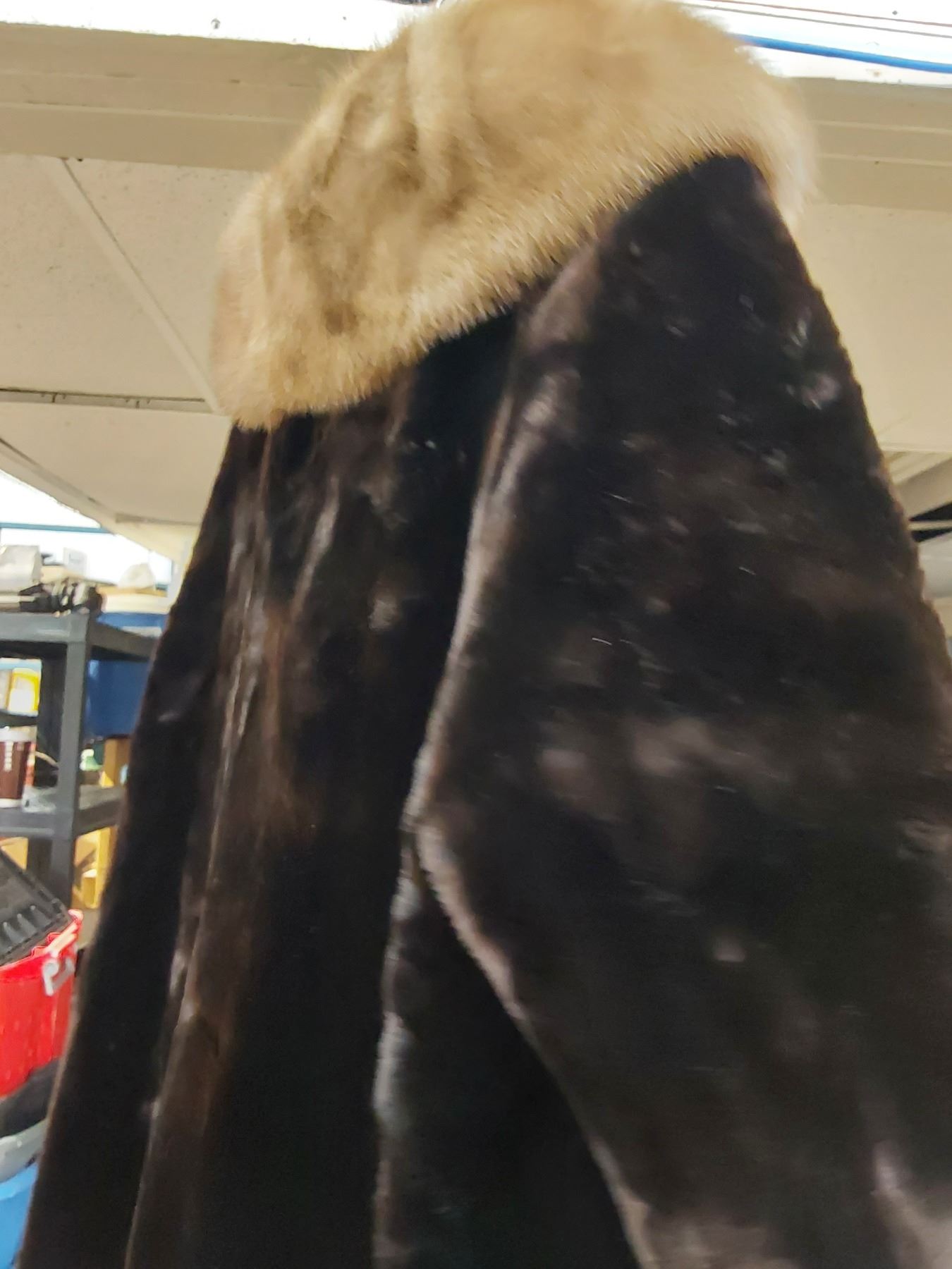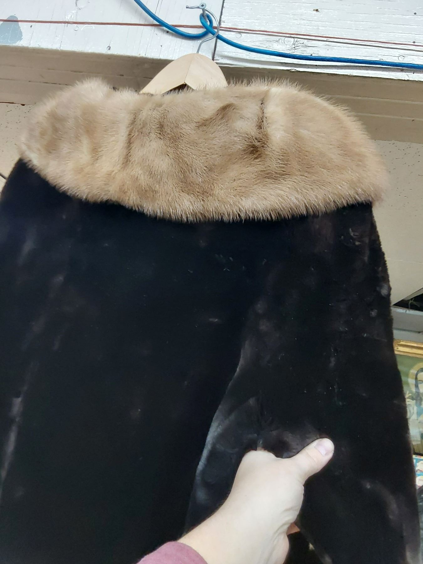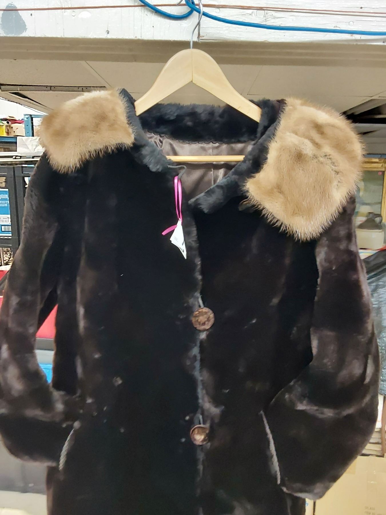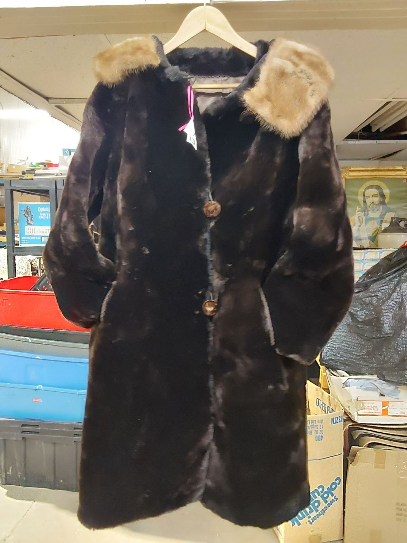 Mouton coat with fur collar, 3/4 length, Ladies Large, very good condition