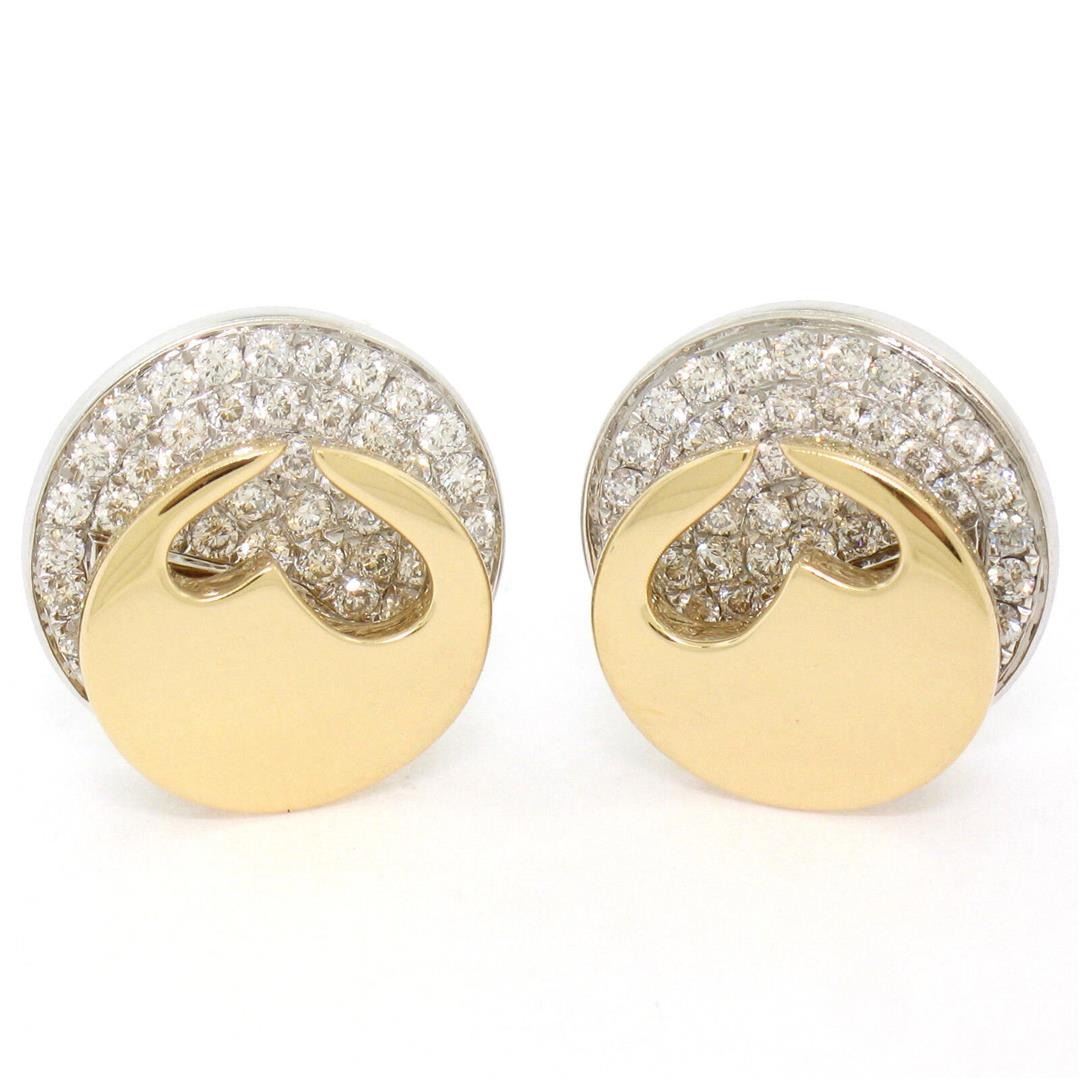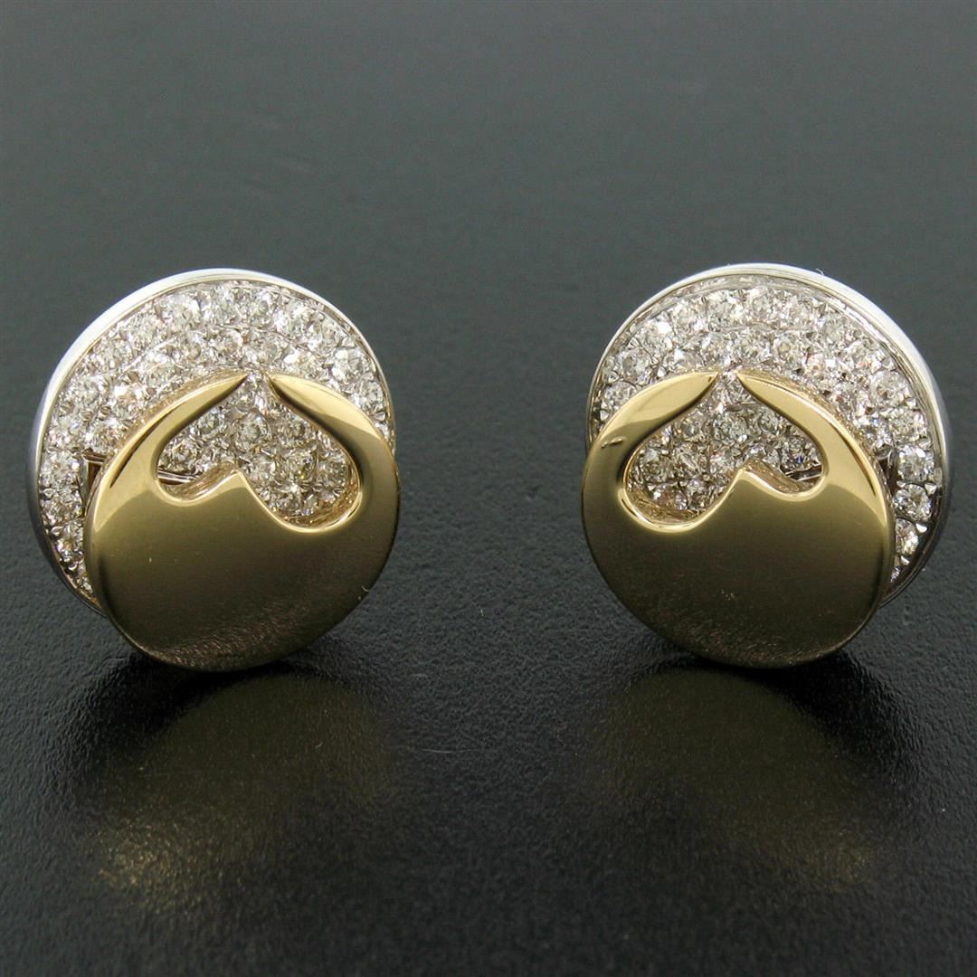 Movado 18K Two Tone Gold 1.80ctw FINE Round Diamond & Heart Disk Button Earrings. Please see photos and description for all available information. An estate solid 18k yellow and white gold button earrings by Movado, featuring 66 round brilliant cut natural diamonds (E- VVS1; 1.80ctw). The earrings measure approximately 15.05mm in diameter and weigh a total of 11.05 grams.