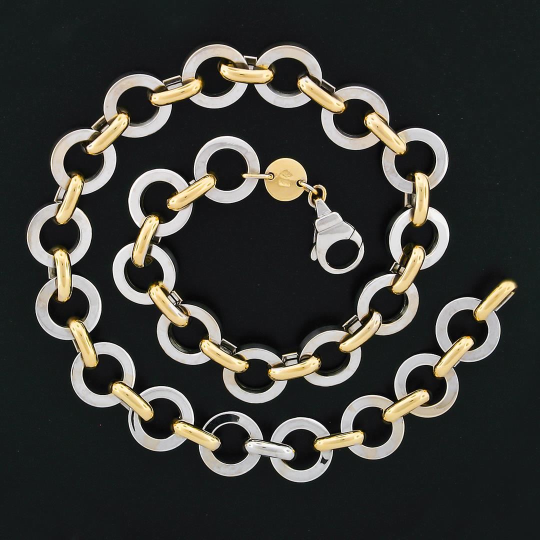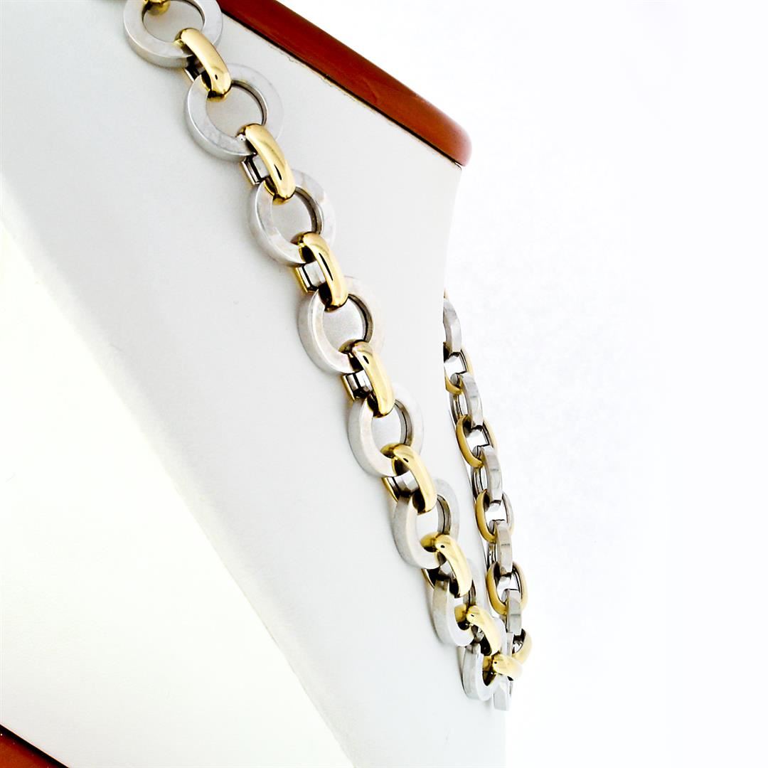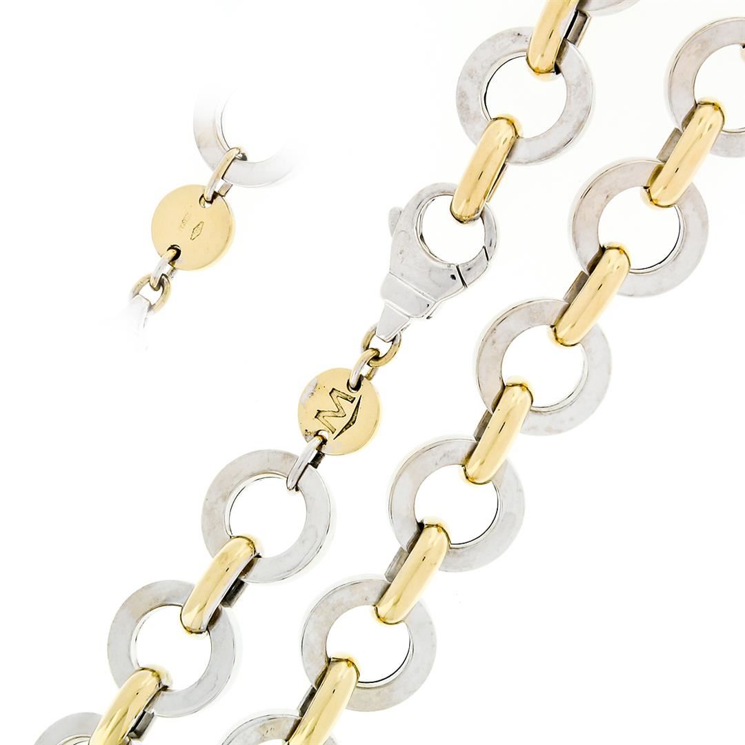 An authentic solid 18k two tone gold necklace by Movado with open interlocking round & oval links. 17 inch length, 57.39 grams total weight.