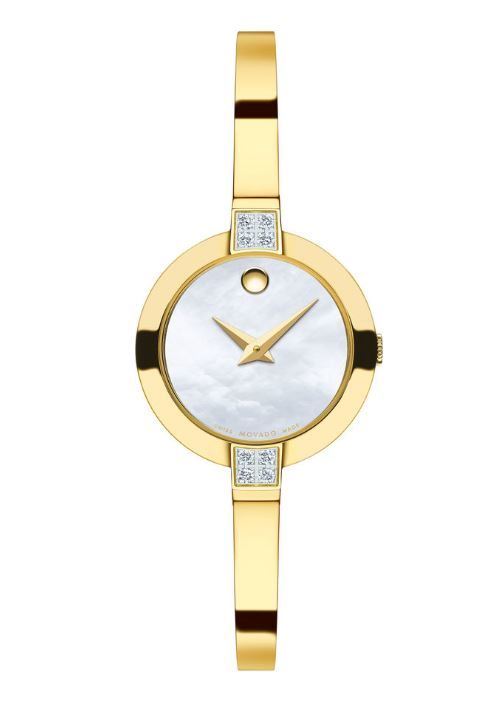Model: 607000 - CASE = [Material:Yellow Gold PVD Finished Stainless Steel], [Case Diameter:25], [Water Resistant:30 Meters - 100 Feet], [Crystal:Sapphire], DIAL = [Color:White Mother of Pearl Dial with Gold Toned Dot and Hands], MOVEMENT = [Type:Swiss Quartz], BAND = [Clasp:Folding], [Type:Yellow Gold PVD Finished Stainless Steel], (Usually ships in 2 to 4 weeks.)