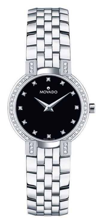 Model: 605586 - CASE = [Material:Stainless Steel], [Case Diameter:25], [Bezel:Fixed with Diamonds], [Case Back:Solid], [Water Resistant:30 Meters - 100 Feet], [Crystal:Scratch Resistant Sapphire], DIAL = [Color:Black with Diamonds], MOVEMENT = [Type:Quartz], [Crown:Push In], BAND = [Clasp:Deployment], [Type:Stainless Steel], (Usually ships in 1 to 2 weeks.)