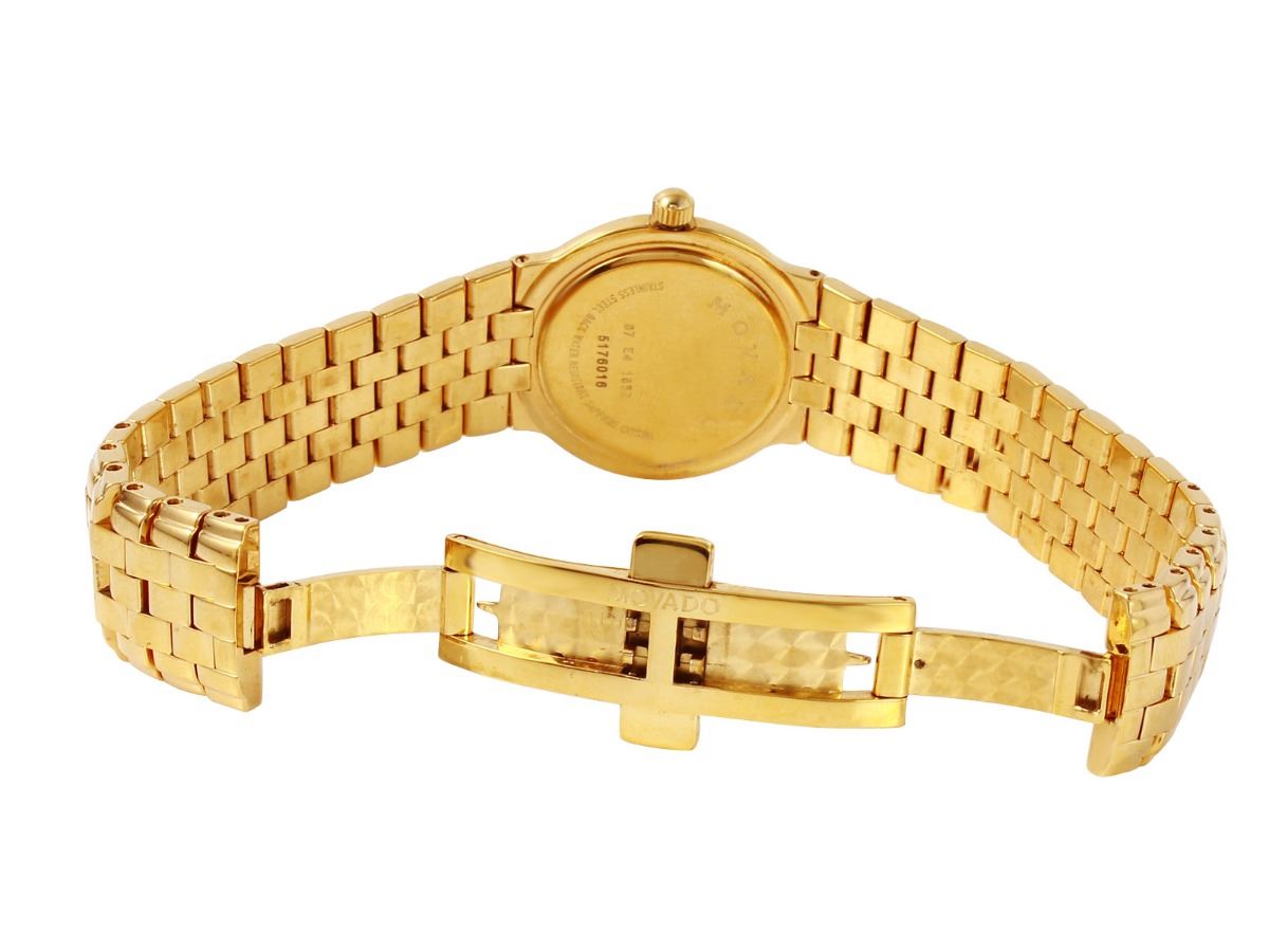 Movado Museum gold plated stainless steel Lady’s watch with mother-of-pearl dial. Quartz movement, case 25mm in diameter. Bracelet 6” with hidden clasp. Case, dial, crystal and bracelet are in very good condition. The descriptions listed should not be construed as an appraisal. The detail is provided as a guideline for color, clarity, weights and measurements to the best of our ability. We welcome inspections. WE SHIP WORLDWIDE!