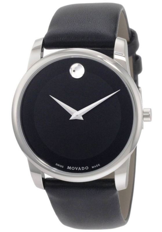 Model: 606502 - CASE = [Material:Stainless Steel], [Case Diameter:40], [Case Thickness:7mm], [Bezel:Fixed], [Case Back:Solid], [Water Resistant:30 Meters - 100 Feet], [Crystal:Scratch Resistant Sapphire],; DIAL = [Color:Black Museum with Silver Toned Dot and Hands],; MOVEMENT = [Type:Battery Powered Quartz],; BAND = [Clasp:Tang], [Type:Black Calfskin Leather], (Usually ships in 1 to 2 weeks.)
