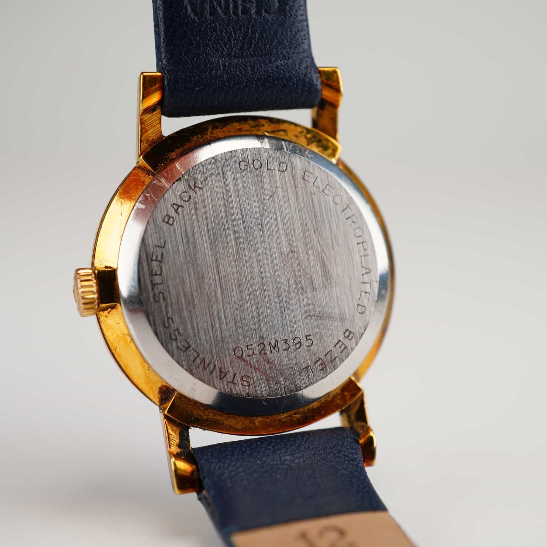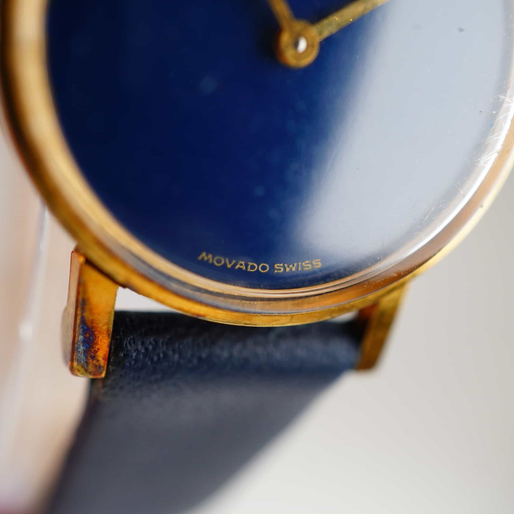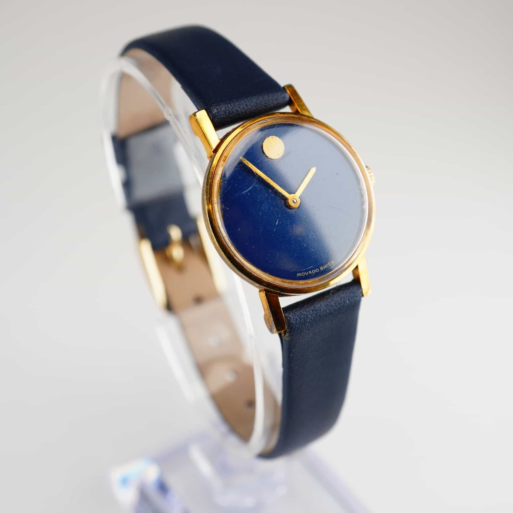 This Movado Museum wristwatch features a navy blue minimalist dial with a gold-tone concave dot at the 12 o'clock position and gold-tone dauphine hands. The dial is signed Movado Swiss at the 6 o'clock position. The case consists of a gold electroplated bezel and a stainless steel case back. The case back is stamped with the reference number 052M395 and material markings. The watch is fitted with a navy blue smooth calf leather strap marked WBHQ and 12 on the interior. The movement is quartz.