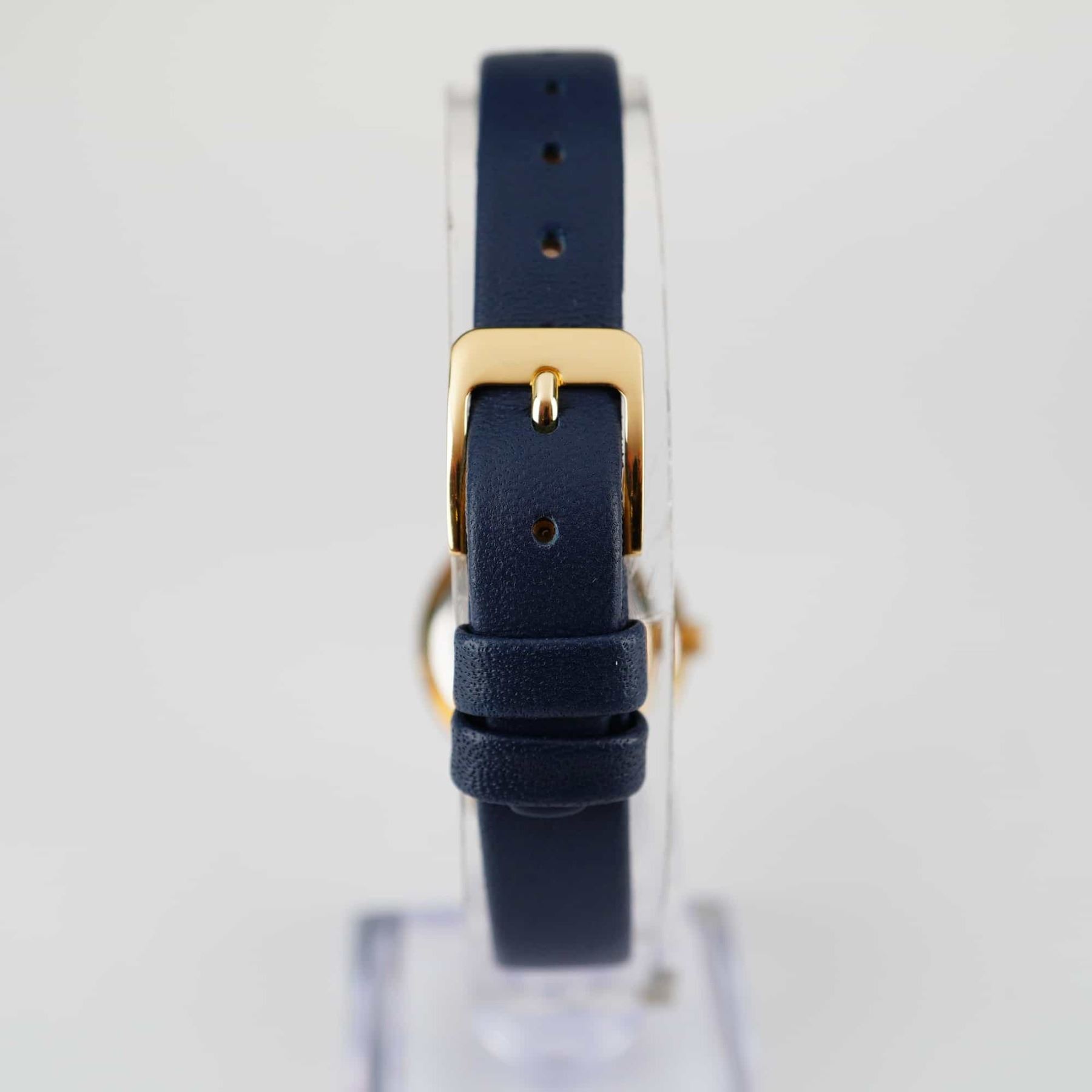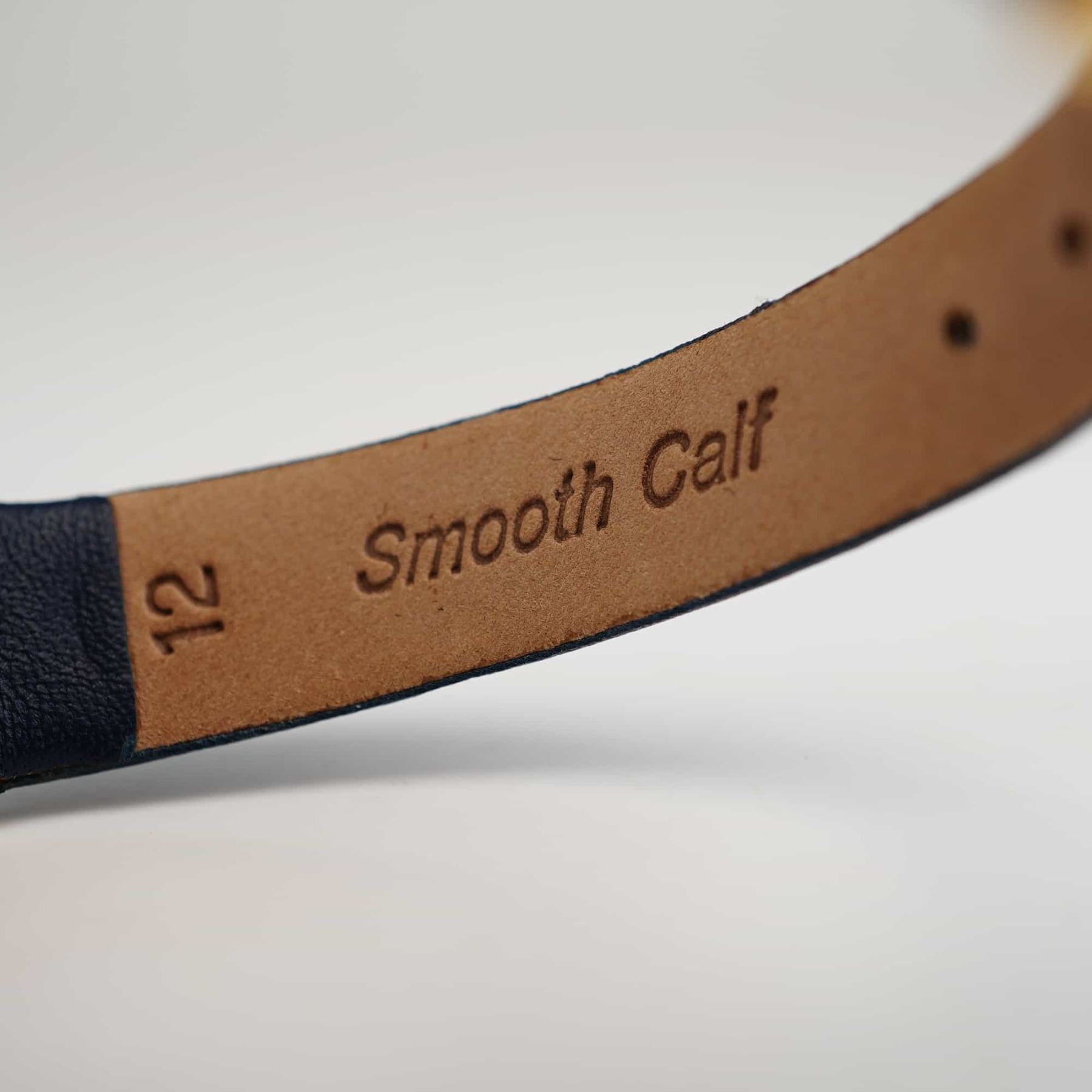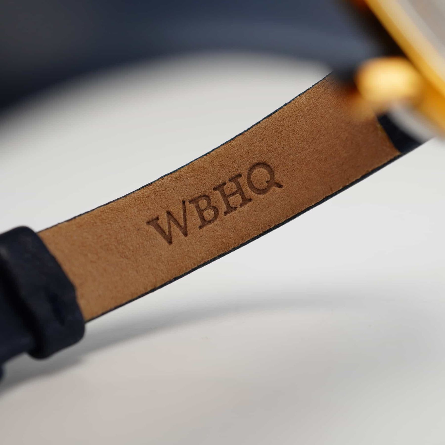 This Movado Museum wristwatch features a navy blue minimalist dial with a gold-tone concave dot at the 12 o'clock position and gold-tone dauphine hands. The dial is signed Movado Swiss at the 6 o'clock position. The case consists of a gold electroplated bezel and a stainless steel case back. The case back is stamped with the reference number 052M395 and material markings. The watch is fitted with a navy blue smooth calf leather strap marked WBHQ and 12 on the interior. The movement is quartz.