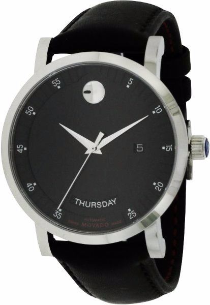 Model: 606845 - CASE = [Material:Stainless Steel], [Case Diameter:42], [Bezel:Fixed], [Case Back:Solid], [Water Resistant:30 Meters - 100 Feet], [Crystal:Scratch Resistant Sapphire],; DIAL = [Color:Black],; MOVEMENT = [Type:Quartz], [Crown:Push In],; BAND = [Clasp:Tang], [Type:Black Leather], (Usually ships in 1 to 2 weeks.)