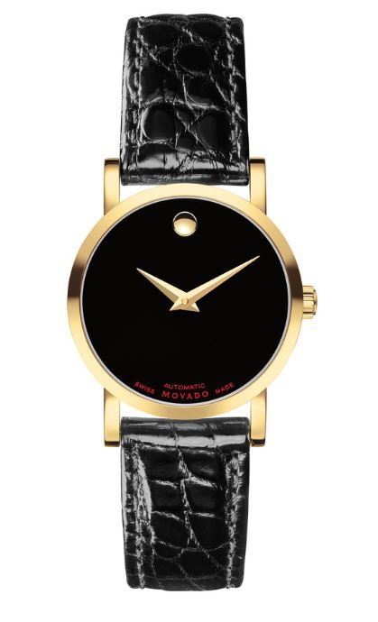 Model: 607010 - CASE = [Material:Yellow Gold PVD Finished Stainless Steel], [Case Diameter:26], [Water Resistant:30 Meters - 100 Feet], [Crystal:Sapphire], DIAL = [Color:Black Museum Dial with Yellow Gold Toned Dot and Hands], MOVEMENT = [Type:Swiss Automatic], BAND = [Clasp:Tang], [Type:Black Alligator Leather], (Usually ships in 2 to 4 weeks.)