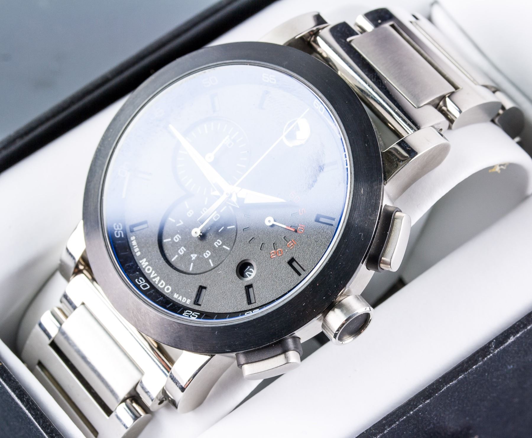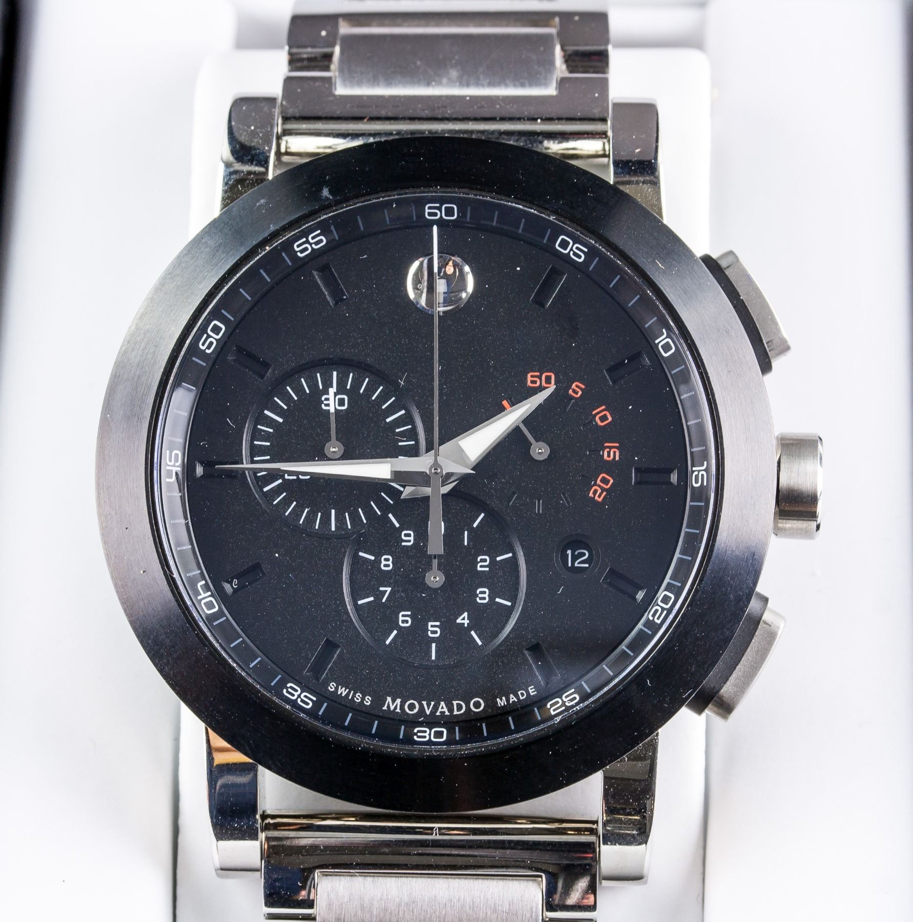 Movado Swiss made watch; chronograph, stainless steel dial and band; water resistant; sapphire crystal; 0.1.14.1162;13038697. Retail value $1495
