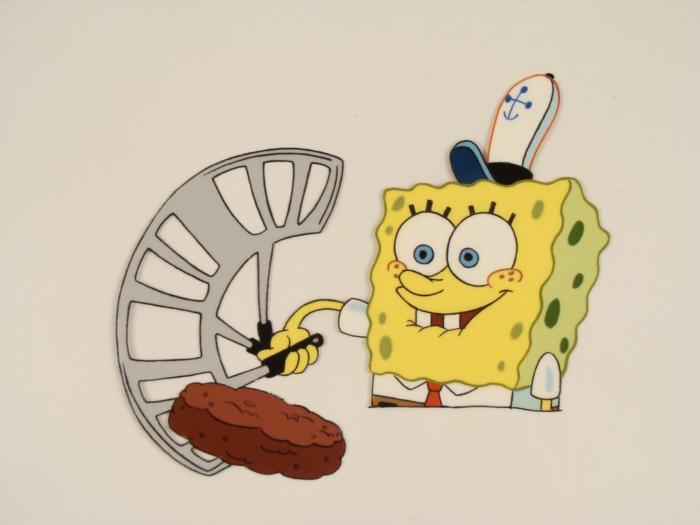 This original animation cel is from the Nickelodeon TV show SpongeBob Squarepants. The story takes place under the deep blue sea in Bikini Bottom, where SpongeBob resides. SpongeBob, who is a yellow, porous sponge, is your typical happy-go-lucky character, as he is always cheerful and enjoys making people laugh. Patrick Star, SpongeBob's neighbor who is a starfish, is your average children's show idiot, as he boasts knowing nothing and is often getting himself into ridiculous situations. Between the homes of these two lies the home of the miserable Squidward, a squid, who is known for being grouchy and playing tricks on SpongeBob and Patrick. Both SpongeBob and Squidward work at the Krusty Krab, a fast food business run by the greedy money-loving Mr. Krabs, a crab, the arch rival of the evil, possibly misunderstood, Plankton. Another neighbor, Sandy Cheeks, an athletic squirrel who normally wears an astronaut's space suit, was introduced in "Tea at the Treedome." She spends most of her time inventing and experimenting.SpongeBob's spatula is moving fast Original Production Animated Cel Overall Size of Cel: 10 1/2" x 12 1/2" Very Good ConditionThis is an original hand-painted cel set-up used in the production of an episode of "SpongeBob SquarePants." Each one-of-a-kind set-up represents a slight change in position of the characters. When individually photographed and projected in rapid succession, the images appear to move.
