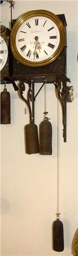 Mouvement de morbier à 6 cloches, trois corps de rouages, échappement ancre à recul, cadran émail à fleurs et chiffres romains, signé FREDERIC DEPIERRE A THONON, époque 1880