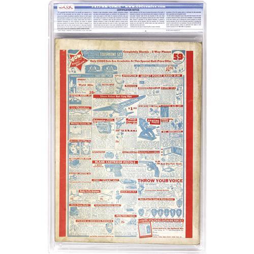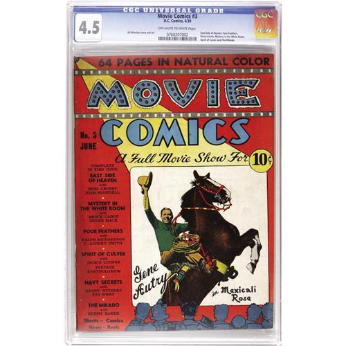 <B>Movie Comics #3 (DC, 1939) CGC VG+ 4.5 Off-white to white pages.</B></I> A rarely seen, early Golden Age DC featuring the first ever Gene Autry photo cover, plus adaptations of "East Side of Heaven," "Four Feathers," "Mystery in the White Room," "Spirit of Culver," and "The Mikado." Gerber rates this one an "8," or "rare." Overstreet 2006 VG 4.0 value = $340. CGC census 7/06: 1 in 4.5, 3 higher. <BR><BR><B>Important notice:</B> Heritage usually auctions material at the rate of 200-250 lots per hour. On some occasions eBay Live bid software or the Internet may not be able to keep up with the pace of the auction. We recommend placing a realistic absentee bid now as insurance to avoid disappointment. Occasionally the auctioneer may eliminate or reject an eBay Live bid, and the auctioneer may also reopen a lot after the close of the eBay live bidding (usually because we missed an audience bid), and may reject your bid even if it shows you as the winning bidder. By bidding via eBay Live, you agree that Heritage may award the lot to another bidder at its sole discretion under the circumstances described above or any other reasonable circumstances. Since eBay bids are not shown to us until we open the lot on the floor, we treat those bids just like floor bids. In most cases the floor responds before the eBay bid is presented to us, due to Internet lag time, so for consistency we have made it a policy that floor bids are always considered first over tie eBay live bids. Also please note that all Heritage lots purchased through eBay Live carry a 22.5% Buyer's Premium. Please make sure you read the Terms and Conditions before you bid. This lot is being auctioned in conjunction with a live floor auction by Heritage Auction Galleries. All final auction and invoice information will be supplied by Heritage Auction Galleries, and all other information should be considered preliminary. Lot:41001 <BR><BR><B>Winning Notification and Billing:</B> After the FINAL session in this auction is complete, Heritage will send e-mail and snail mail invoices. This process normally takes several days. All final auction and invoice information will be supplied by Heritage Auction Galleries, and all other information should be considered preliminary. <BR><BR>This auction will be conducted on a live auction floor and over the Internet through eBay Live. If you choose to place an absentee bid, please take a moment to <font color='#0000ff'><u><a href='http://pages.ebay.com/liveauctions/help/before/laabsentee.html'>learn how eBay Live absentee bidding works</a></u></font><font color='#000000'>