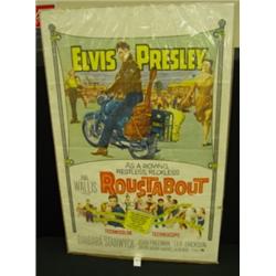 "Roustabout" movie one-sheet. Elvis Presley & Barbara Stanwyck. 1964. Elvis on motorcycle with his guitar. Condition: Good