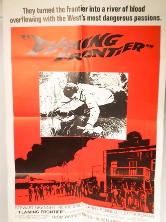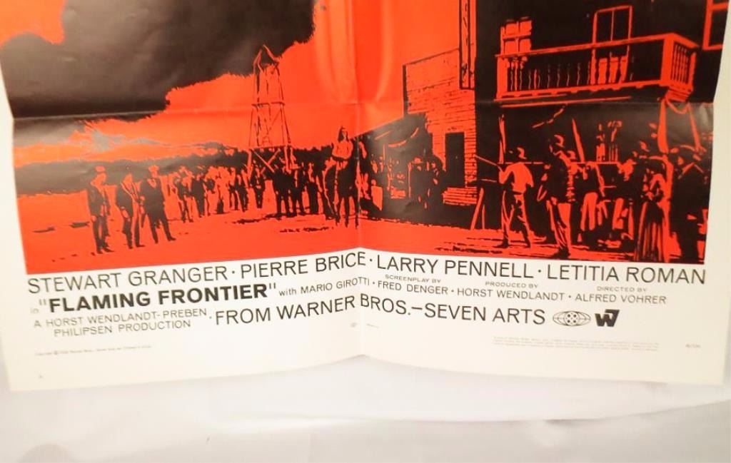 Large movie poster for th e1968 Warner Bros film "Flaming Frontier" starring Stewart Granger, Pierre Brice, Larry Pennell, and Lititia Roman. 40x27". colors bright, no tears in the folds. Clean and good looking.