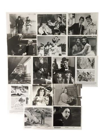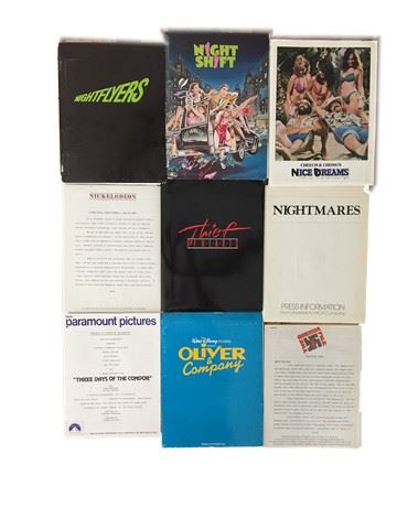 Collection of 9 press kits with black and white publicity stills included, sized mainly 8"x10"s from various movie studios. (1970's-90's).From The Ladd Company "Night Shift" (1982), includes press kit with 23 stills. From Columbia Pictures "Nickelodeon"(1982) includes press kits and 7 stills. From Columbia Pictures "Nice Dreams" (1981) includes press kit with 12 stills. From Paramount Pictures "Theif Of Hearts" (1984) includes press kit with 12 stills. From Universal "NightMares" (1983) includes press kit with 8 stills. From Paramount Pictures "Three Days of the Condor"(1975) includes press kits and 21 stills. From 20th Century Fox "NightFlyers" (1987) includes press kits and 6 stills. From Columbia Pictures "The Odessa File" (1974) includes press kits and 2 stills. From Walt Disney Pictures "Oliver & Company" (1988) includes press kit and 5 stills.