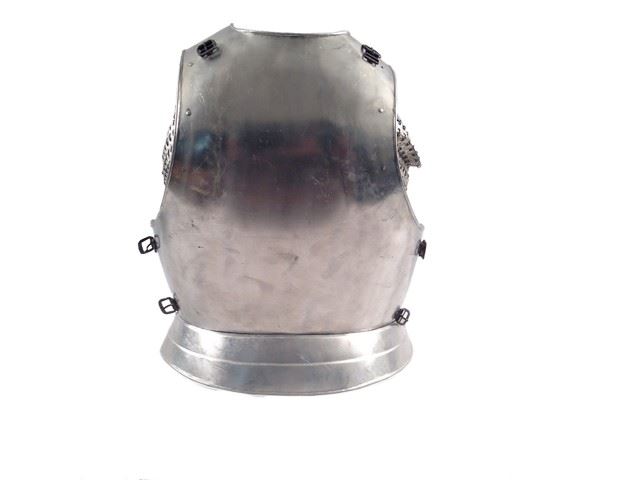 Armor from an unidentified film. Includes chest plate, back plate, and two arm vambraces The chest and back plate are thin metal and they have leather straps on the neck and around the sides. Item may vary slightly from actual photo. (Chest plate approx. 22" x 17") (Back plate approx. 20" x 16") (Vambrace approx. 10 1/2" x 4 1/2")