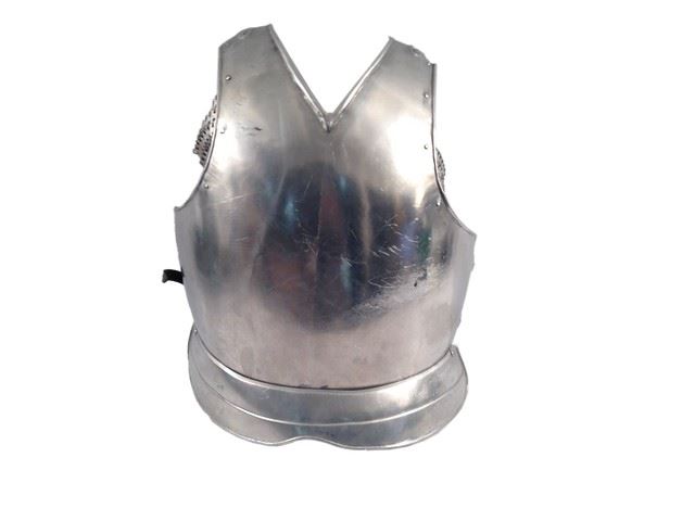 Armor from an unidentified film. Includes chest plate, back plate. The chest and back plate are thin metal and they have leather straps on the neck and around the sides. Item may vary slightly from actual photo. (Chest plate approx. 22" x 17") (Back plate approx. 20" x 16") (Vambrace approx. 10 1/2" x 4 1/2")