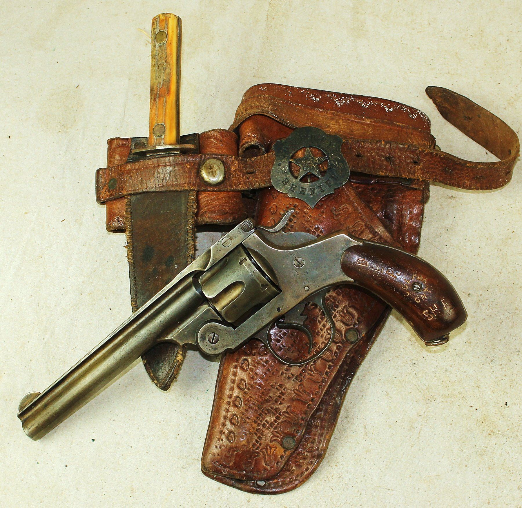 A nice looking tooled holster and gun belt with a 44 caliber Mexican Smith and Wesson break top revolver and 5" bone handled knife.