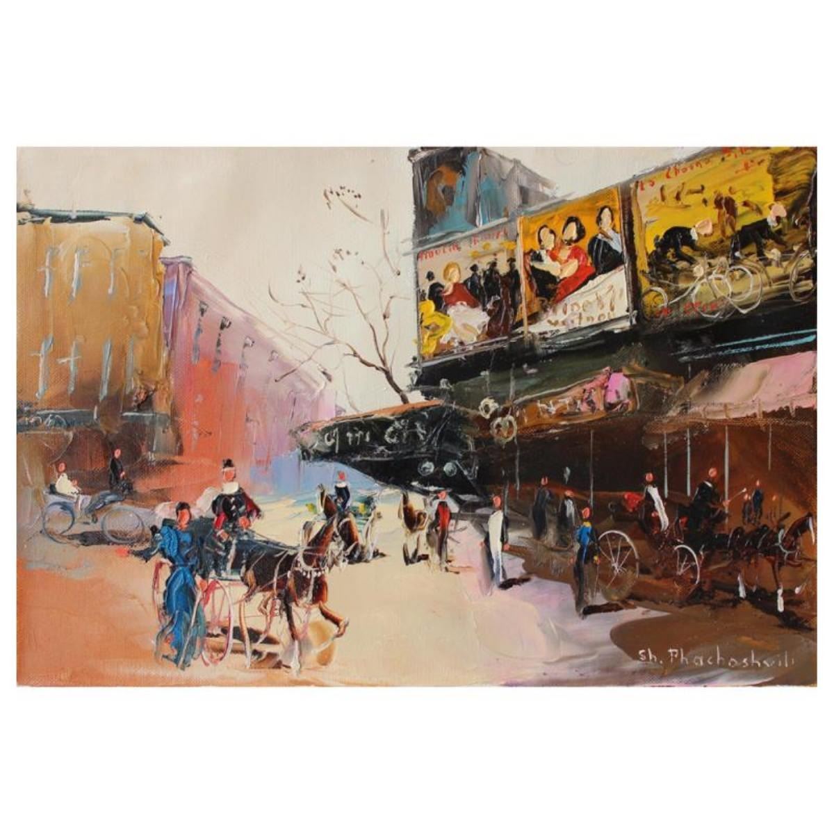 "Movie Theater" is an original Oil on Canvas by Shalva Phachoshvili. The piece is hand signed and comes with a Certificate of Authenticity. Measures approximately 15" x 10".