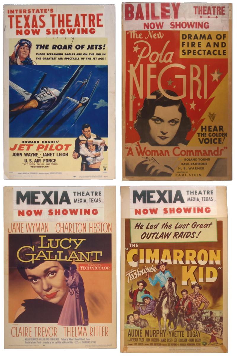 Movie window cards (4), Howard Hughes' in The Roar of Jets, Pola Negri w/Basil Rathbone, Lucy Gallant w/Jane Wyman & Charlton Heston & The Cimarron Kid w/Audie Murphy & Yvette Dugay, all from Texas theaters in the 1940's-50's, all VG/Exc cond & 22"H x 14"W.