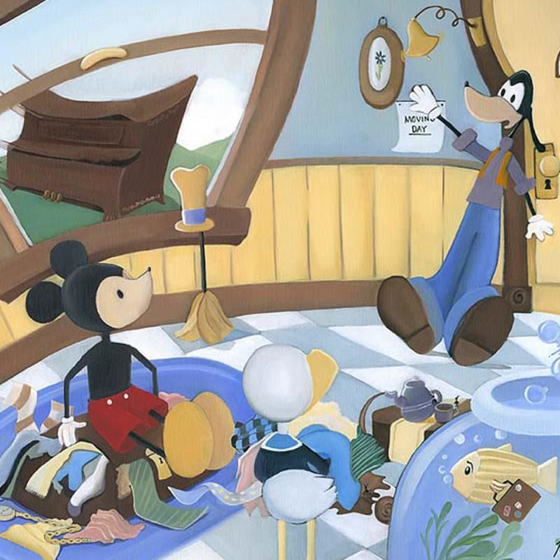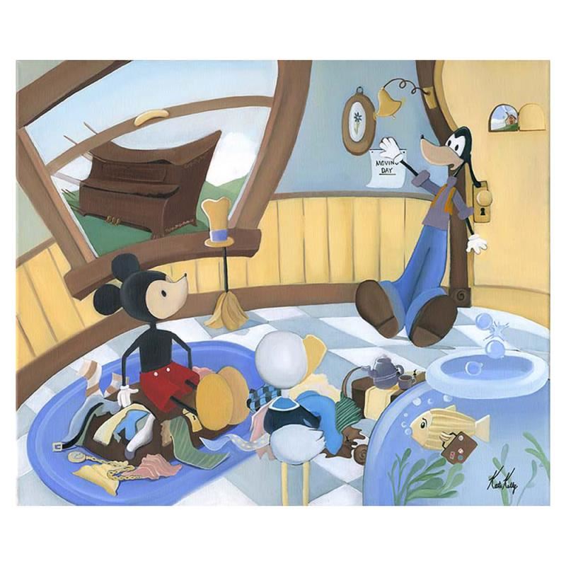 "Moving Day" is a limited edition giclee on canvas, numbered and hand signed by Katie Kelly! This piece is licensed by Disney Fine Art. This piece has a 2" border and may be framed or gallery wrapped based on preference. Includes Certificate of Authenticity! Measures approx. 24" x 20" (image).