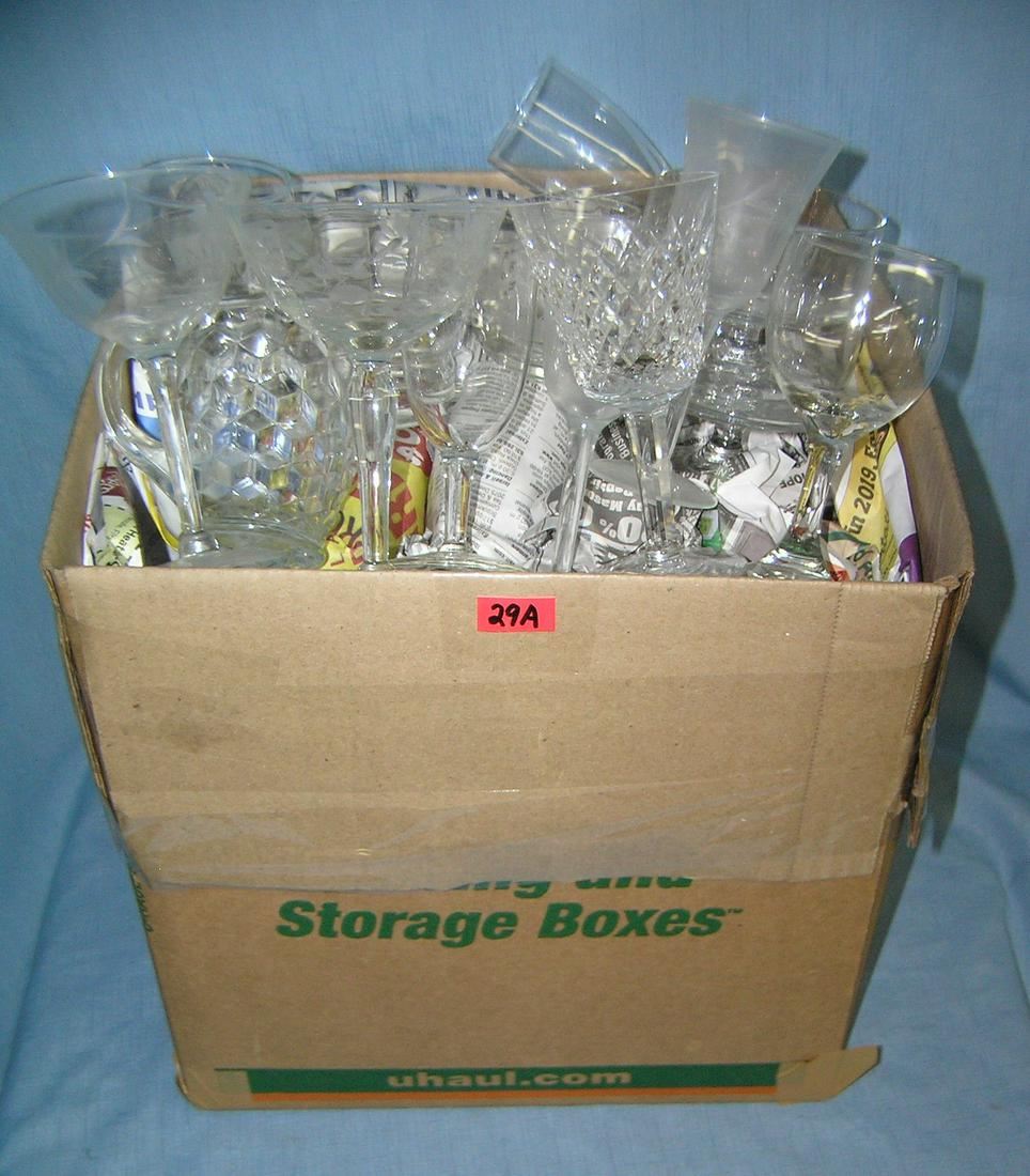 Moving and Storage Company box lot marked William's family crystal and glass ware from dinig room area part of a moving and storage company seized or unclaimed merchandise group sent to auction for liquidation est. value $40.00-50.00