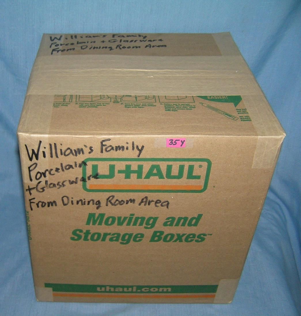 Moving and Storage Company mystery box lot marked William's family porcelain and glassware from dining room area part of a moving and storage company seized or unclaimed merchandise group sent to auction for liquidation est. value $100.00-150.00
