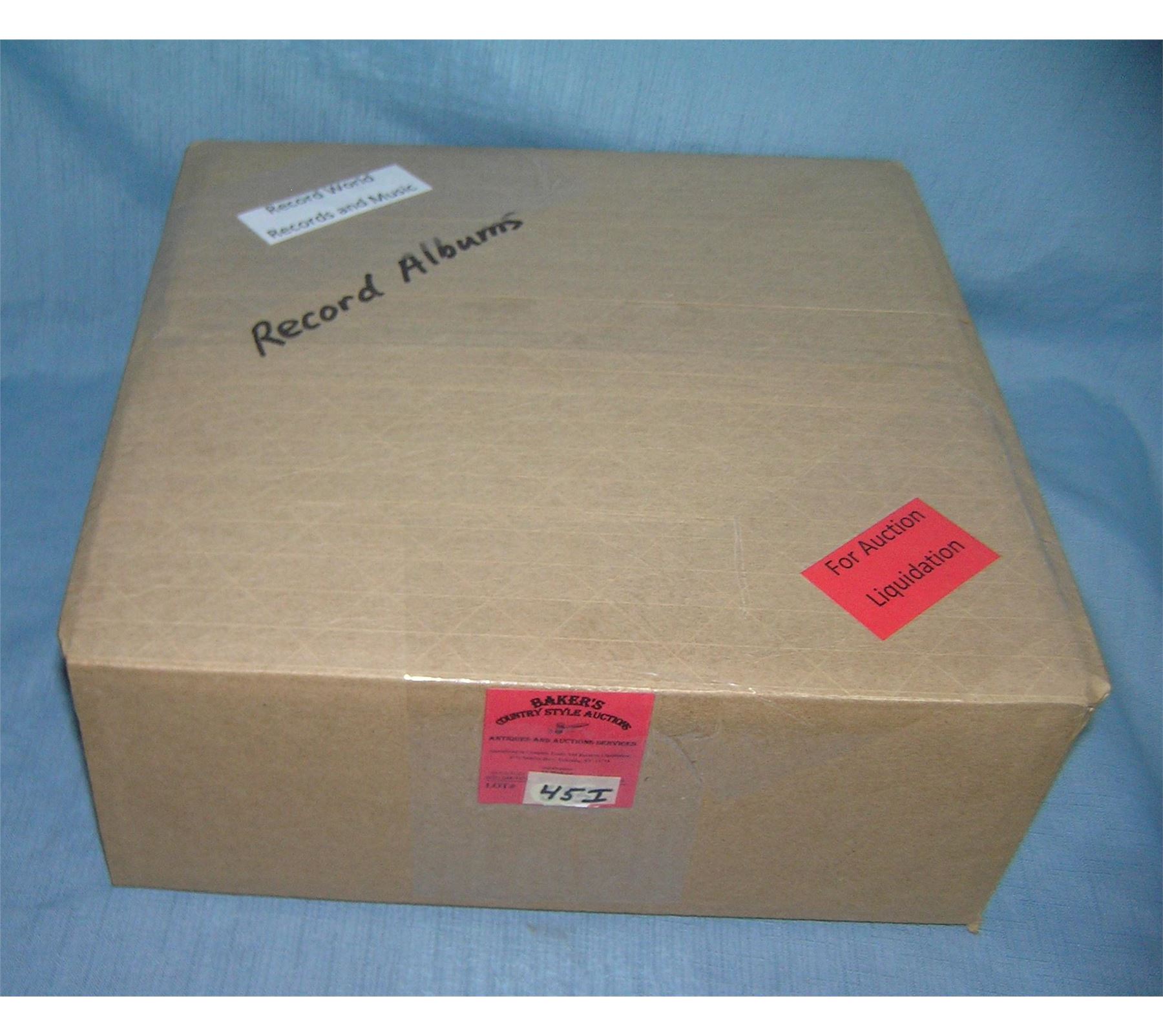 Moving and Storage Company mystery box lot marked Record World records and Music record albums part of a moving and storage company seized or unclaimed merchandise group sent to auction for liquidation contents removed from an old Long Island record store est. value $65.00-75.00