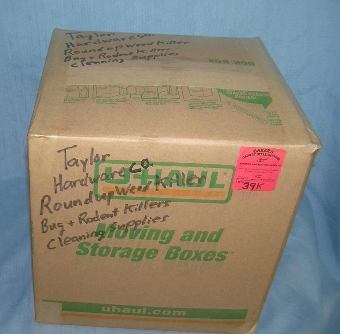 Moving and Storage Company mystery box lot marked Taylor Hardware Co. Round up weed, bug and rodent, cleaners part of a moving and storage company seized or unclaimed merchandise group sent to auction for liquidation est. value $50.00-60.00