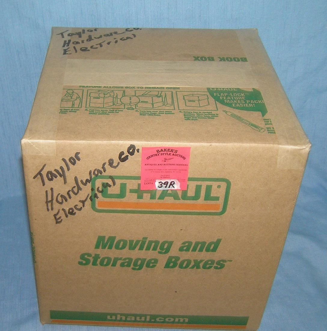 Moving and Storage Company mystery box lot marked Taylor Hardware Co electrical..part of a moving and storage company seized or unclaimed merchandise group sent to auction for liquidation est. value $50.00-60.00