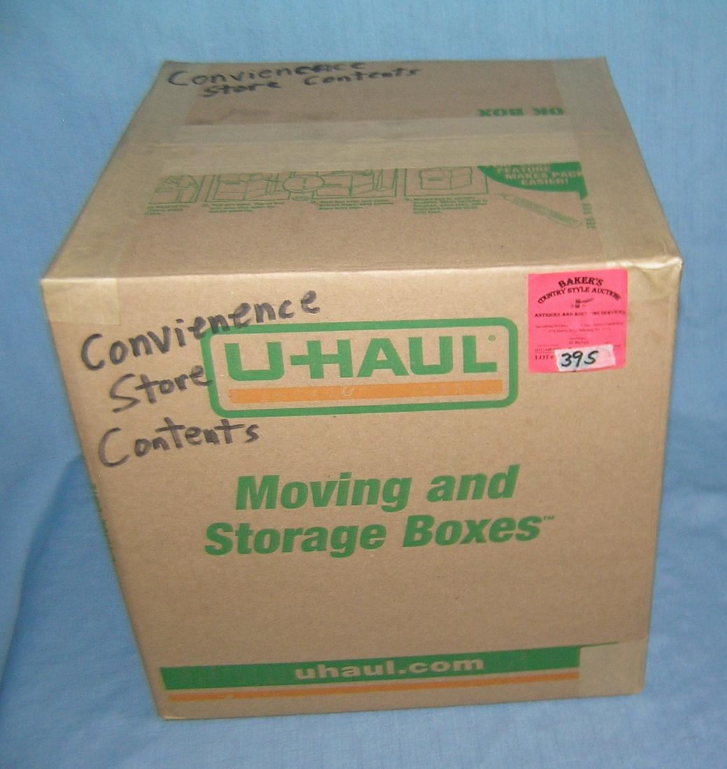 Moving and Storage Company mystery box lot marked convienence store contents part of a moving and storage company seized or unclaimed merchandise group sent to auction for liquidation est. value $50.00-60.00