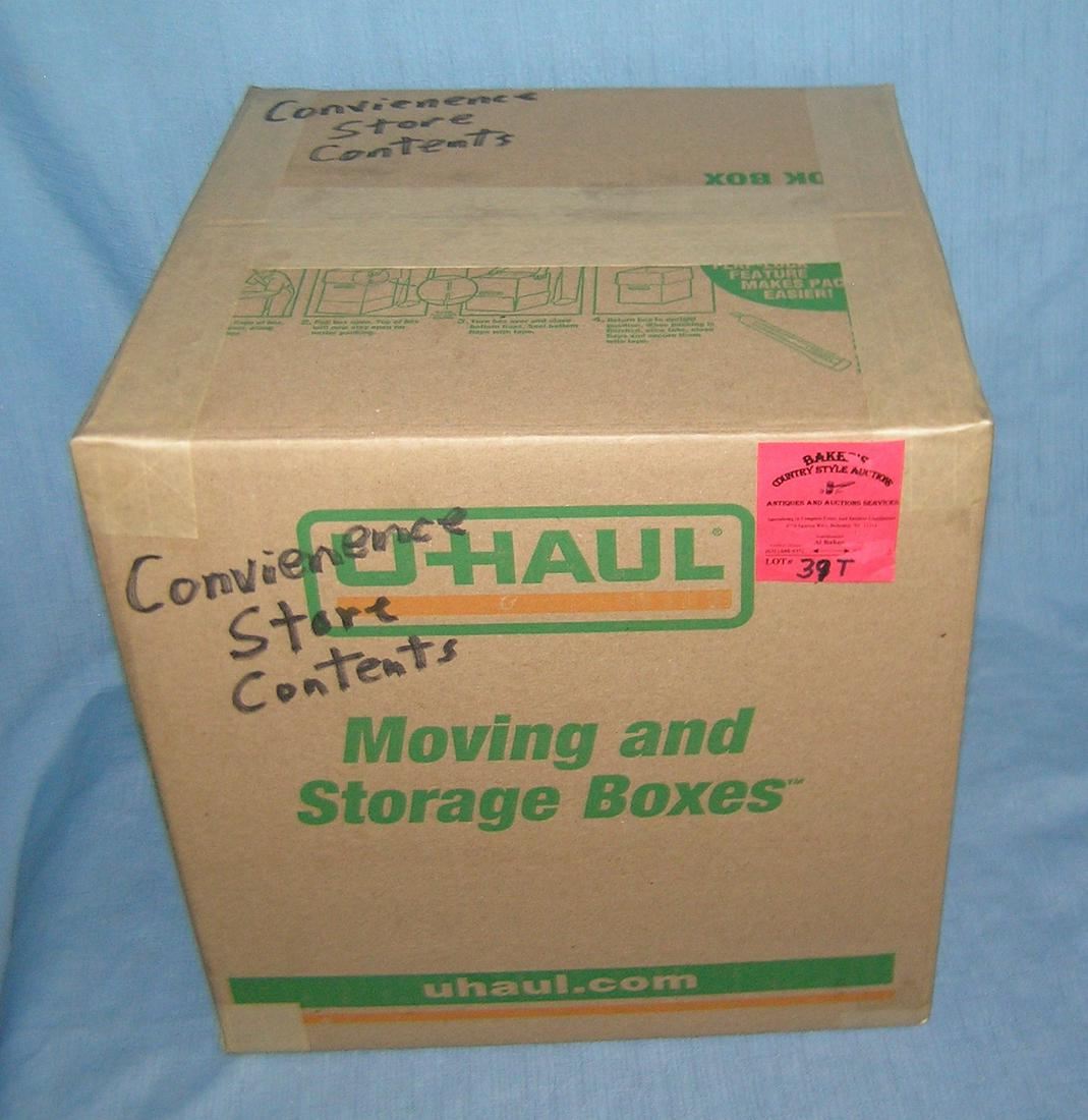 Moving and Storage Company mystery box lot marked convienence store contents part of a moving and storage company seized or unclaimed merchandise group sent to auction for liquidation est. value $50.00-60.00